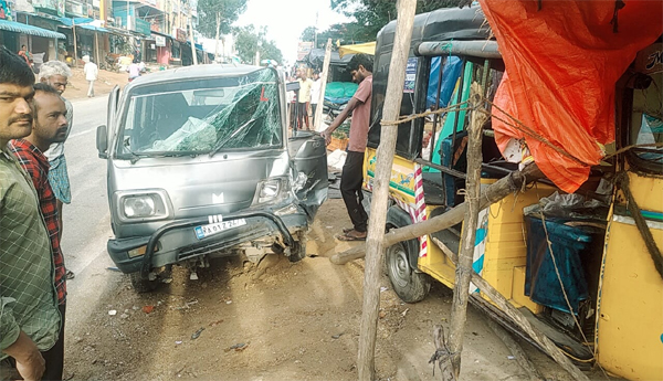 ప్రజాశక్తి-బైరెడ్డిపల్లి (చిత్తూరు) : దుకాణం వద్ద ఆగి ఉన్న ఆటోను ఓమిని కారు ఢీకొన్న ఘటన మంగళవారం పలమనేరు నుండి కుప్పం జాతీయ రహదారిపై చోటుచేసుకుంది. ఆ సమయంలో దుకాణం వద్ద ఎవరూ లేకపోవడంతో ప్రాణాపాయం తప్పింది. పలమనేర్ టు కుప్పం జాతీయ రహదారిపై ఉన్న జిల్లా పరిషత్ ఉన్నత పాఠశాల గేట్ సమీపాన కూరగాయల దుకాణం ఉంది. దుకాణ యజమాని కూరగాయలను వేసుకుని అంగడి వద్ద ఏపీ 03.టి. ఇ.0204 ఆటోను ఆపాడు. అదే మార్గంలో బెంగళూరు నుంచి ఓమిని కేఏ 01 జెడ్ 2471 నంబర్ ఉన్న కారు విరపాచపురం వెళ్లేందుకు వస్తుండగా.. అతివేగంతో ఆగి ఉన్న ఆటోని ఢీకొట్టింది. ఆటో ధ్వంసమయ్యింది. ఓమ్ని కారు ముందు భాగం నుజ్జునుజ్జయింది. స్థానిక ట్రాఫిక్ అధికారులు వెంటనే స్పందించి రోడ్డు పక్కనే ఉన్న కూరగాయ దుకాణాన్ని వెనక్కి జరిపేలా చర్యలు తీసుకోవాలని లేకపోతే ఇలాంటి ప్రమాదాలు జరుగుతూనే ఉంటాయని స్థానికులు కోరుతున్నారు.