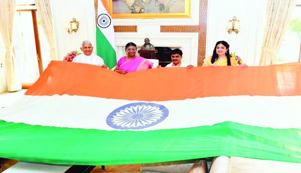 ప్రజాశక్తి-న్యూఢిల్లీ బ్యూరో : జాతీయ జెండా అంటేనే అందరికీ ఎనలేని గౌరవం. మువ్వన్నెల జెండాను చూస్తేనే ఒళ్ళంతా పులకరిస్తుంది. అలాంటి ప్రపంచంలోనే తొలి అతుకులు, కుట్లు లేని అశోకచక్రంతో సహా చేనేత జాతీయ జెండాను ఆంధ్రప్రదేశ్కు చెందిన రుద్రాక్షల సత్యనారాయణ తయారు చేశారు. ఈ జెండా కోసం ఏకంగా తన ఇంటిని సైతం అమ్మకున్నట్లు సత్యనారాయణ తెలిపారు. సోమవారం నాడిక్కడ రిటైర్డు ఐఎఎస్ రామచంద్రు తెజావత్, సినీ నటి పూనం కౌర్తో కలిసి సత్యనారాయణ రాష్ట్రపతి ద్రౌపది ముర్మును కలిశారు. ఈ సందర్భంగా సత్యనారాయణ ప్రతిభ, అంకుటిత దీక్షను ముర్ము అభినందించారు. అనంతరం ఎపి, తెలంగాణ భవన్లో సత్యనారాయణ మీడియాతో మాట్లాడారు. జాతీయ జెండాను రూపొందించిన పింగళి వెంకయ్య స్ఫూర్తితో ఈ అతుకులు లేని 8×12 సైజ్లో జెండాను తయారుచేసినట్లు చెప్పారు. అలాగే ఎర్రకోటపై ఈ జెండాను ఎగరాలనేది తన కల అని అన్నారు. ఈ విషయాన్ని దృష్టిలో పెట్టుకుని ఎర్రకోటపై ఎగిరే జెండా నిబంధనలు, సైజులను పాటించానన్నారు. ఈ విషయాన్ని రాష్ట్రపతి ముర్ముకు వివరించగా... ఆమె సానుకూలంగా స్పందించారన్నారు. ఎర్రకోటపై ఈ జెండాను ఎగురవేసే అంశంతో పాటూ, ఆర్థికంగా ఆదుకునే విషయంలో అధికారులకు ఆదేశాలిచ్చినట్లు చెప్పారు. కాగా, ఈ జెండా తయారీ కోసం గడిచిన నాలుగేళ్లలో రూ.6.50 లక్షలు ఖర్చు చేసినట్లు వెల్లడించారు. పూర్తిస్థాయి జెండా ప్రయత్నంలో 24 జెండాలు పాడయ్యాయన్నారు. అలాగే రాష్ట్ర ప్రభుత్వాలు ఎగురవేసే 4×6 సైజు జెండాలు రూపొందించినట్లు చెప్పారు. ప్రస్తుతం ఎర్రకోటపై ఎగురవేస్తోన్న జెండా కర్ణాటకలో తయారవుతోందని రామచంద్రు తెజావత్ తెలిపారు. ఆ జెండాకు ఐఎస్ఐ ముద్ర, ఇతర నిబంధనలు ఉంటాయన్నారు.