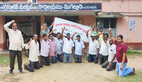 మొగల్తూరు (పశ్చిమ గోదావరి) : వీఆర్ఏల న్యాయమైన సమస్యలను ప్రభుత్వం వెంటనే పరిష్కరించాలని సిఐటియు జిల్లా ఉపాధ్యక్షులు తెలగంశెట్టి సత్యనారాయణ డిమాండ్ చేశారు. మొగల్తూరు లోని రెవెన్యూ కార్యాలయం వద్ద వీఆర్ఏల రాష్ట్ర సంఘం పిలుపుమేరకు రెండో రోజు శుక్రవారం సిఐటియు ఆధ్వర్యంలో వీఆర్ఏలు మోకాళ్లపై కూర్చుని వినూత్నంగా నిరసన ప్రదర్శన చేశారు. ఈ సందర్భంగా ఆయన మాట్లాడారు. వీఆర్ఏలకు పే స్కేల్ వర్తింపజేయాలని నామినిలను వీఆర్ఏలుగా గుర్తించాలని, అర్హత ఉన్న వారిని పదోన్నతి కల్పించాలన్నారు, డిఏ తో కూడిన వేతనం ఇవ్వాలని ఆయన డిమాండ్ చేశారు. ఈ కార్యక్రమంలో ఆ సంఘ అధ్యక్షుడు కోటిపల్లి వేణు, చంటిబాబు, గణేష్, కఅష్ణ, సత్యనారాయణ, శ్రీను, ప్రసాద్, తదితరులు పాల్గొన్నారు
