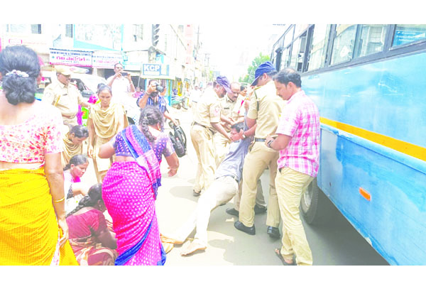 ప్రజాశక్తి - రాజమహేంద్రవరం ప్రతినిధి గత ఎన్నికల సమయంలో ప్రతిపక్ష నాయకుడిగా వైఎస్ జగన్మోహన్ రెడ్డి అంగన్వాడీలకు ఇచ్చిన హామీలను అధికారంలోకి వచ్చిన తరువాత విస్మరించారు. గత నాలుగున్నరేళ్లుగా వివిధ రూపాల్లో తమ సమస్యలను పరిష్కరించాలని, ఎన్నికల సమయంలో ఇచ్చిన హామీలను అమలు చేయాలని డిమాండ్ చేస్తూ అంగన్వాడీలు ప్రభుత్వానికి వివిధ రూపాల్లో వినతిపత్రాలు, నిరసనల రూపంలో తెలియచేశారు. అయినా జగన్ సర్కార్ నుంచి ఎటువంటి ఫలితం లేకుండా పోయింది. పైగా ప్రజా ఉద్యమాలను నిషేధాలూ, క్రూర నిర్బంధంతో అణిచివేసేందుకు జగన్ ప్రభుత్వం పోలీసులతో ఉక్కుపాదాన్ని మోపుతోంది. అయితే కార్మికోద్యమాల్ని, ప్రజా ఉద్యమాలను అణచివేయడం సాధ్యం కాదని చరిత్ర రుజువు చేసిన సందర్భాలు అనేకం ఉన్నాయి. బెదిరింపులు, హెచ్చరికలకు భయపడి అంగన్వాడీలు వెనకడుగు వేయరని మరోసారి నిరూపించారు. అంగన్వాడీలు సోమవారం చలో విజయవాడకు సిద్ధమయ్యారు. ఎక్కడికక్కడ వారిని గృహానిర్బంధాలు, అరెస్టులకు పాల్పడినా మొక్కవోని దీక్షతో పోలీసుల ఆంక్షలను నెట్టుకుని మరీ చలో విజయవాడకు తరలివెళ్లేందుకు సిద్ధమయ్యారు. రైల్వేస్టేషన్లు, ఆర్టీసీ డిపోల వద్ద దొరికిన వారిని దొరికినట్లు ఆయా పోలీస్స్టేషన్లకు తరలించారు. విజయవాడకు వెళ్లకుండా అడ్డుకుని ఆదివారం రాత్రి తొమ్మిది గంటల వరకూ అంగన్వాడీలను నిర్బంధించి వ్యక్తిగత పూచికత్తులతో విడుదల చేశారు. ఈ నిర్బంధాన్ని నిరసిస్తూ సోమవారం అంగన్వాడీలు రాజమహేంద్ర వరంలో శాంతియుత నిరసనకు సమాయత్తమయ్యారు. శ్యామలా సెంటర్లో ధర్నా ప్రారంభమైన కొద్ది సమయానికే పోలీసులు పలు రూపాల్లో అడ్డంకులు సృష్టించారు. ధర్నా ప్రాంతం నుంచి వెళ్లిపోవాలని, లేనిపక్షంలో అరెస్టులు తప్పవని హెచ్చరికలు జారీ చేశారు. శాంతియుతంగా ధర్నా చేసుకునే హక్కు తమకు ఉందని అంగన్వాడీలు స్పష్టం చేశారు. ధర్నాను విరమించేది లేదని తెగేసి చెప్పారు. దీంతో టు టౌన్ సిఐ పి.గణేష్ ఆదేశాలతో పోలీసులు అంగన్వాడీలు, నాయకులపై దాష్టీకానికి పాల్పడ్డారు. కార్యకర్తల చేతుల్లో ఫ్లెక్సీలను లాక్కున్నారు. ప్రతిఘటించిన అంగన్వాడీలు, నాయకులను ఈడ్చుకుంటూ వెళ్లి పోలీసు వాహానాల్లో పడవేశారు. ఈ పెనుగులాటలో కొంత మంది అంగన్వాడీలు, నాయకులు గాయపడ్డారు. పోలీసుల అత్యుత్సాహంతో ఆ ప్రాంతంలో కొద్దిసేపు భయానిక వాతావరణం నెలకొంది. సిఐటియు జిల్లా అధ్యక్ష, ప్రధాన కార్యదర్శులు ఎం.సుందర బాబు, బి.రాజులోవ, సిపిఎం నగర కార్యదర్శి బి.పవన్లతోపాటు, ఇతర నాయకులను అరెస్టు చేసి టూ టౌన్ స్టేషన్కు తరలించారు. మధ్యాహ్నాం 2.30 గంటల సమయంలో వారిని వ్యక్తిగత పూచీకత్తుపై విడుదల చేశారు. ఈ సందర్భంగా నాయకులు మాట్లాడుతూ ఎన్నికల సమయంలో అంగన్వాడీలకు ఇచ్చిన హామ