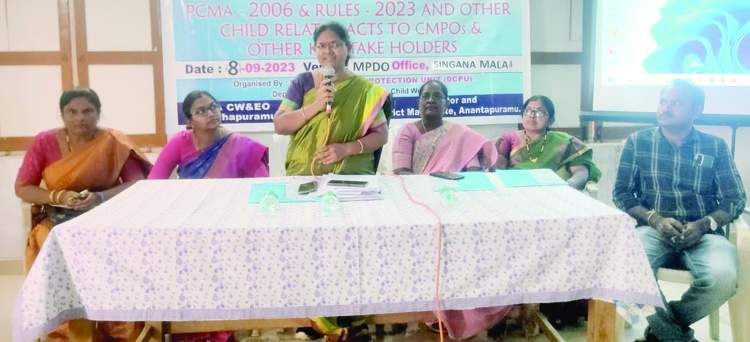 ప్రజాశక్తి-శింగనమల బాల్య వివాహాలను అరికట్టేందుకు ప్రతి ఒక్కరూ కృషి చేయాలని మహిళా, శిశు సంక్షేమ శాఖ పీడీ బిఎన్.శ్రీదేవి పిలుపునిచ్చారు. శుక్రవారం మండలంలోని ఎంపిడిఒ కార్యాలయంలో డిసిపిఒ సుబ్రమణ్యం, ఛైల్డ్ హెల్ప్లైన్ 1098 జిల్లా ప్రోగ్రాం కోఆర్డినేటర్ కృష్ణమాచారి ఆధ్వర్యంలో బాల్య వివాహ నిరోధక అధికారాలు, విధులపై డివిజినల్ స్థాయి ఒకరోజు శిక్షణా కార్యక్రమం నిర్వహించారు. ఈ సందర్భంగా ఆమె మాట్లాడుతూ బాల్య వివాహాలను నిరోధించడంలో ప్రతి ఒక్కరి బాధ్యత అన్నారు. ముఖ్యంగా గ్రామస్థాయిలో విఆర్ఒ, పంచాయతీ కార్యదర్శులు, మహిళా పోలీసులు బాధ్యతాయుతంగా పనిచేయాలన్నారు. వీరందరూ గ్రామాల్లో బాల్యవివాహాలు చేయడం వల్ల కలిగే అనార్థలను ప్రజలకు వివరించాలన్నారు. అనంతరం బాల్యవివాహాల నిషేధ చట్టం-2006 గోడ పత్రికలను విడుదల చేశారు. ఈ కార్యక్రమంలో సిడబ్ల్యూసి ఛైర్పర్సన్ రామలక్ష్మి, సిడిపిఒ ఉమా శంకరమ్మ, శింగనమల ఎంపిడిఒ నిర్మలాకుమారి, గార్లదిన్నె ఎంపిడిఒ తేజోష్ణ, డిఎంఅండ్హెచ్ఒ కార్యాలయ డెమోలు త్యాగరాజు గంగాధర్, ఐసిడిఎస్ సిడిపిఒలు సూపర్వైజర్లు, అధికారులు పాల్గొన్నారు.