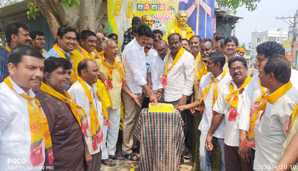 ప్రజాశక్తి - కాళ్ళ : ఉత్తమ ఆశయాలతో పుట్టిన తెలుగుదేశం పార్టీ ఉన్నతికి ప్రతి ఒక్కరు కృషి చేయాలని ఉండి ఎమ్మెల్యే మంతెన రామరాజు పిలుపునిచ్చారు. మండల కేంద్రమైన కాళ్ల లో చంద్రబాబు నాయుడు 74వ జన్మదిన వేడుకలు పార్టీ శ్రేణులు గురువారం ఘనంగా నిర్వహించారు. కాళ్ల మండల కేంద్రంలో టిడిపి నేతలు ముందుగా పార్టీ జెండాను ఆవిష్కరించి, స్వర్గీయ ఎన్టీఆర్ విగ్రహానికి పూలమాలలు వేసి నివాళులు అర్పించారు. అలాగే చంద్రబాబు బర్తడే కేకు కట్ చేసి, సంబరాలు జరుపుకున్నారు. ఈ కార్యక్రమంలో మండల టిడిపి అధ్యక్షుడు గుండా బత్తుల వెంకట నాగేశ్వరరావు, మాజీ అధ్యక్షుడు వేణుగోపాలరావు, మాజీ ఎంపీపీ వెంకటరత్న ప్రసాద్, మాజీ ఎంపిటిసి బొత్స గణేష్, టిడిపి నాయకులు తోట పణిబాబు, కొప్పినీడి గణపతి, మంతెన నాగంజనేయులు, గుర్రం వెంకట సత్యనారాయణ, యలమంచిలి వెంకటరమణ తదితరులు పాల్గొన్నారు.
