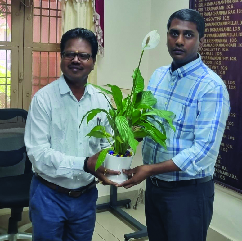 పూల మొక్కను అందజేస్తున్న దృశ్యం