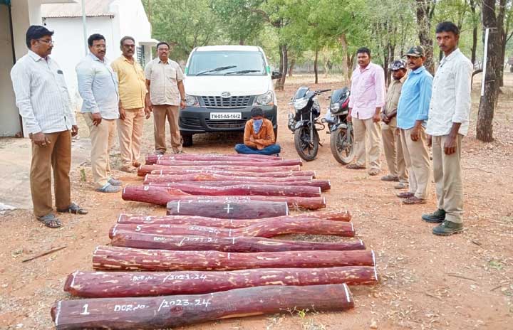 ప్రజాశక్తి -రాపూరు :రాపూరు రేంజ్ పరిధిలో అక్రమంగా ఎర్ర చందనం రవాణాకు సిద్ధమవుతుండగా 17 ఎర్రచందనం దుంగలను మహేంద్ర వాహనాన్ని, రెండు ద్విచక్ర వాహనాలతోపాటు ఒక వ్వక్తిని అదుపులోకి తీసుకున్నట్లు రాపూరు ఫారేస్టు రేంజ్ అధికారి రవీంద్ర బాబు తెలిపారు. ఈ సందర్బంగా రవీంద్రబా బు మాట్లాడుతూ శుక్రవారం జిల్లా అటవీ శాఖ అధికారి అవుల చంద్రశేఖర్కు ఎర్ర చందనం పోరుమావిళ్ల నుంచి అక్రమ రవాణా జరుగుతుందన్న సమా చారం మేరకు జిల్లాలో ఉన్న 5రెంజ్ల పరిధఙలో 4 రేంజ్లు ఆత్మకూరు ఉదయగిరి, రాపూరు, నెల్లూరు అటవీ క్షేత్రాధి కారులను అప్రమత్తం చేశారు. నిఘా పెట్టడం తో శుక్రవారం రాత్రి 11 గంటల ప్రాంతంలో గోనుపల్లి సెక్షన్ తెగచర్ల అడవిలోపల కోడూరు సరిహద్దు తనిఖీలు చేసి పట్టుకున్నారు. వాహనాన్ని, ఎర్రచందనం దుంగలను ఆదూరాపల్లి తరలించినట్లు రేంజర్ రవీంద్రబాబు తెలిపారు.