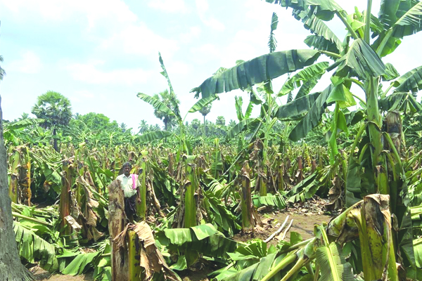 ప్రజాశక్తి-పెరవలి మండలంలోని ముక్కామల గ్రామంలో అరటి తోటలు శనివారం సాయంత్రం ఈదురు గాలులు, జోరువానకు విరగిపోయాయి. సుమారు 150 ఎకరాల్లో గెలలు వేసినవి, గెలలు వేయటానికి సిద్ధంగా ఉన్నవి మొక్క తోటలు చాలామేరకు దెబ్బ తిన్నాయి. సన్న చిన్న కారు, కౌలు రైతులు అరటి పంటలు పూర్తిగా నష్టం పోయారు. కౌలు రైతు బొబ్బిలి సత్తియ్యకు చెందిన నాలుగు ఎకరాల 90 సెంట్ల అరటి తోట ఈదురు గాలికి విరిగిపోయింది. అధికారులు పంట నష్టం అంచనా వేసి పరిహారం ఇవ్వాలని కోరుతున్నారు.