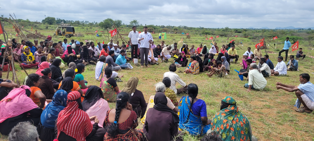 చిలమత్తూరు : శ్రీ సత్యసాయి జిల్లా చిలమత్తూరు మండల కేంద్రంలో పేదలకు ఈ నెల 21వ తేదీన ఇళ్ల పట్టాలు ఇస్తామని హామీ ఇచ్చిన అధికారులు మాట తప్పారు. దీంతో పేదలు సిపిఎం, వ్యకాసం ఆధ్వర్యంలో మళ్లీ పోరుబాట పట్టారు. సర్వే నెంబర్ 805లో ఇళ్ల పట్టాలు ఇవ్వాలని కోరుతూ పేదలు సిపిఎం ఆధ్వర్యంలో పది రోజుల క్రితం భూస్వాధీన పోరాటం నిర్వహించారు. ఈ సమయంలో వారి వద్దకొచ్చి 21వ తేదీన అర్హులైన పేదలందరికీ ఇళ్ల పట్టాలు ఇస్తామని తహశీల్దార్ నాగరాజు హామీ ఇచ్చారు. 21వ తేదీ దాటినా దీని గురించి పట్టించుకోకపోవడంతో సోమవారం నాడు మళ్లీ అదే భూమిలో పేదలు భూస్వాధీన పోరాటం నిర్వహించారు. ఈసందర్భంగా సిపిఎం జిల్లా కార్యదర్శి వర్గ సభ్యులు ఈఎస్.వెంకటేష్, వ్యకాసం జిల్లా అధ్యక్షుడు ప్రవీణ్కుమార్ మాట్లాడుతూ కోడూరు పొలం సర్వే నెంబర్ 805లోనే పేదలకు ఇళ్ల పట్టాలు ఇవ్వాలన్నారు. ఇళ్ల స్థలాల కోసం మళ్లీ భూ స్వాధీన పోరాటం నిర్వహిస్తున్నట్లు చెప్పారు. ఇళ్ల స్థలాలు ఇచ్చేంత వరకు ఈ ఆందోళన ఉధతం చేస్తామన్నారు. మూడేళ్లుగా పేదలకు ఇళ్ల స్థలాలు ఇచ్చేందుకు అధికారులకు చేతులు రాకపోవడం దుర్మార్గం అన్నారు. లబ్ధిదారులుగా గుర్తించిన వారందరికీ ఆమోదయోగ్యమైన స్థలంలో పట్టాలు ఇవ్వాలని డిమాండ్ చేశారు. అప్పటి వరకు ఆందోళన విరమించేది లేదని స్పష్టం చేశారు.