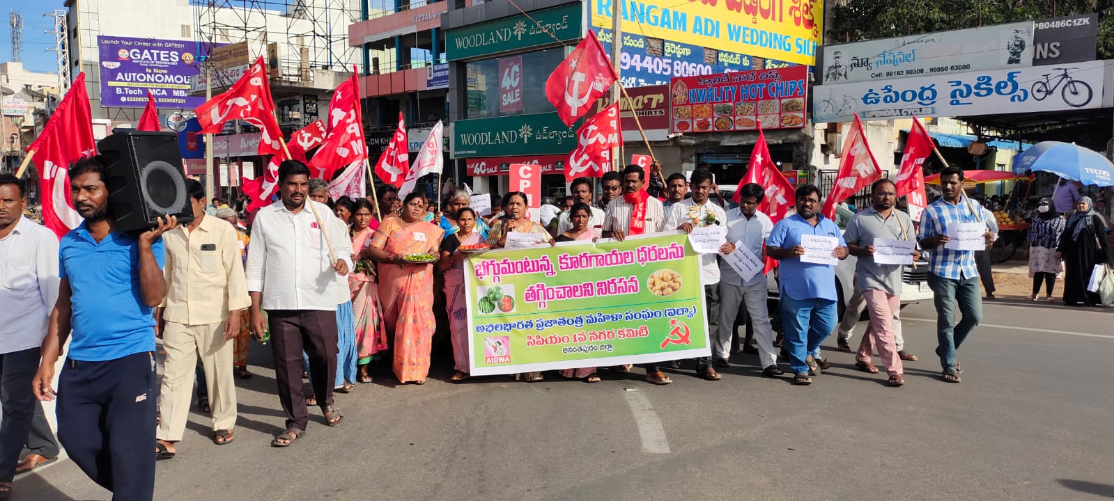 అనంతపురం కలెక్టరేట్ : నిత్యావసరాలు, కూరగాయల ధరలు పెరగడంతో పేదలపై మోయలేని భారాలు పడుతున్నాయని, తక్షణం ఈ ధరలను తగ్గించాలని సిపిఎం, ఐద్వా నాయకులు డిమాండ్ చేశారు. పెరిగిన నిత్యావసరాలు, కూరగాయలు, గ్యాస్, విద్యుత్ ఛార్జీల ధరలు తగ్గించాలని డిమాండ్ చేస్తూ సిపిఎం, ఐద్వా ఆధ్వర్యంలో బుధవారం నాడు అనంతపురం టవర్ క్లాక్ వద్ద నిరసన కార్యక్రమం చేపట్టారు. కూరగాయలు మెడలో తగిలించుకుని, పళ్లెంలో టమోటాలు, మిరపకాయలు, ఇతర కూరగాయలను వేసుకుని వినూత్న రీతిలో నిరసన తెలిపారు. ఈ సందర్భంగా ఐద్వా రాష్ట్ర కోశాధికారి వి.సావిత్రి మాట్లాడుతూ నిత్యావసరాలు, కూరగాయల ధరలు ఆకాశాన్ని అంటుతున్నాయని తెలిపారు. ఏమి కొనాలన్నా రూ.100కు పైగానే ఉన్నాయన్నారు. టమోటా, మిరపకాయలు కిలో వంద రూపాయలు ఉండడంతో పేద మధ్య తరగతి ప్రజలు వాటిని కొనలేని స్థితిలో ఉన్నారన్నారు. ఒక పక్క గ్యాస్, విద్యుత్ ఛార్జీల ధరలు పెరగిన సతమతం అవుతున్న ప్రజలపై నిత్యావసరాల భారాలు మరింత నడ్డివిరుస్తున్నాయని ఆవేదన వ్యక్తం చేశారు. పెరిగిన నిత్యావసర, కూరగాయల ధరలను తగ్గించడంలో కేంద్ర, రాష్ట్ర ప్రభుత్వాలు పూర్తిగా విఫలం చెందాయని ఆగ్రహం వ్యక్తం చేశారు. సిపిఎం 1వ నగర కార్యదర్శి వి.రామిరెడ్డి మాట్లాడుతూ కూరగాయల సాగు చేసే రైతులకు గిట్టుబాటు ధర కల్పించని ప్రభుత్వం ప్రజలపై మాత్రం అధిక ధరల భారం పడుతున్నా చేష్టలుడిగి చూస్తోందన్నారు. ధరలను నియంత్రించడంలో కేంద్ర, రాష్ట్ర ప్రభుత్వాలు ఘోరంగా విఫలం అయ్యాన్నారు. దళారి వ్యవస్థ ప్రజలు, రైతులను దోపిడీ చేస్తున్నా పాలకులు ప్రేక్షకపాత్ర వహించడం సిగ్గుచేటుగా ఉందన్నారు. తక్షణమే ప్రభుత్వం మొద్దు నిద్రవీడి పెరిగిన నిత్యావసరాల ధరలు తగ్గించాలని డిమాండ్ చేశారు. ఈ కార్యక్రమంలో సిపిఎం జిల్లా నాయకులు ముస్కిన్, వెంకటనారాయణ, నగర కమిటీ నాయకులు ప్రకాష్, వలీ, మసూద్, లక్ష్మీనరసమ్మ, డివైఎఫ్ఐ జిల్లా అధ్యక్ష, ప్రధాన కార్యదర్శులు బాలకృష్ణ, నరసింహారెడ్డి, ఎస్ఎఫ్ఐ జిల్లా ప్రధాన కార్యదర్శి పరమేష్, భగత్సింగ్ ఆటో యూనియన్ నాయకులు ఎన్టీఆర్ శీనా పాల్గొన్నారు.