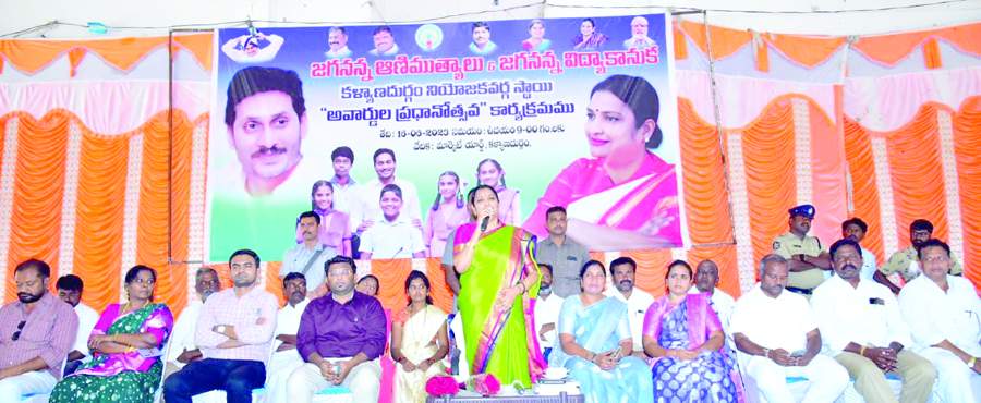 ప్రజాశక్తి-కళ్యాణదుర్గం రాష్ట్రంలో ఉన్న ప్రతి పేద విద్యార్థీ ఉన్నత చదువులు చదవాలన్నదే ముఖ్యమంత్రి జగనన్న లక్ష్యమని మంత్రి ఉషశ్రీచరణ్ అన్నారు. శుక్రవారం స్థానిక మార్కెట్యార్డు ఆవరణలో జగనన్న ఆణిముత్యాలు, జగనన్న విద్యాకానుక నియోజకవర్గ అవార్డుల ప్రదానోత్సవ కార్యక్రమం నిర్వహించారు. ఈ సందర్భంగా మంత్రి మాట్లాడుతూ ప్రతి పేద విద్యార్థి అన్నిరంగాల్లో అభివృద్ధి చెందాలన్న లక్ష్యంతో సిఎం జగన్ ప్రయివేటు పాఠశాలలకు ధీటుగా ప్రభుత్వ పాఠశాలలను అభివృద్ధి చేస్తున్నారన్నారు. ప్రస్తుత పోటీ ప్రపంచంలో ఇంగ్లీష్ ప్రాధాన్యతను గుర్తించి ప్రతి ఉన్నత పాఠశాలలో ఇంగ్లీష్ మీడియంకు అత్యధిక ప్రాధాన్యత ఇస్తున్నారన్నారు. వీటితోపాటు నాణ్యమైన విద్యను అందించేందుకు విద్యావ్యవస్థలో విప్లవాత్మక మార్పులు తీసుకొచ్చారన్నారు. ఈ అవకాశాన్ని ప్రతి విద్యార్థి సద్వినియోగం చేసుకుని ఉన్నత చదువులు చదవాలన్నారు. ఈ కార్యక్రమంలో ఆర్డీఓ నిశాంత్రెడ్డి, ఎంఇఒ విజయలక్ష్మిలతోపాటు ఆయా శాఖల అధికారులు, ఉపాధ్యాయులు, అధ్యాపకులు, విద్యార్థుల తల్లితండ్రులు, వైసీపీ నాయకులు పాల్గొన్నారు.