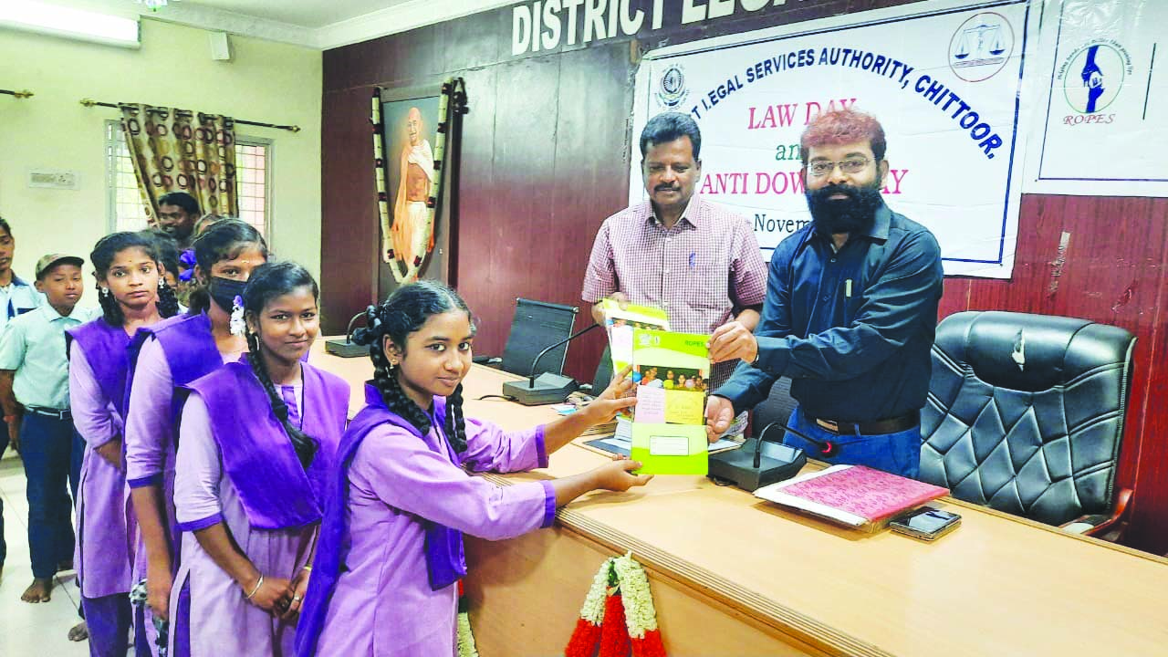 ప్రజాస్వామ్యం, రాజ్యాంగ విలువల గురించి విద్యార్థులలో అవగాహన పెంచడానికి రాజ్యాంగ దినోత్సవం జరుపుకుంటున్నామని జిల్లా న్యాయ సేవ అధికార సంస్థ, సీనియర్ సివిల్ జడ్జి డాక్టర్ ఐ. కరుణ కుమార్ పేర్కొన్నారు. శనివారం ఉదయం స్థానిక జిల్లా న్యాయ సేవ భవనంలో రోప్ స్వచ్ఛంద సంస్థ అధ్యక్షుడు ధన శేఖర్తో కలసి రాజ్యాంగ దినోత్సవం సందర్భంగా విద్యార్థులకు, పారా లీగల్ వలంటర్లకు భారత రాజ్యాంగంలో పొందుపరిచిన ప్రాథమిక హక్కులు, చట్టాలపై అవగాహన కల్పించారు. రోప్ స్వచ్చంద సంస్థ ద్వారా విద్యార్థులకు నోట్ బుక్స్ ను పంపిణీ చేశారు. అనంతరం ఆర్ కె యం లా కళాశాల నందు ప్రిన్సిపాల్ జనార్దన్ రెడ్డితో కలసి నిర్వహించిన రాజ్యాంగ దినోత్సవ కార్యక్రమంలో ఆయన మాట్లాడుతూ లా విద్యార్థులు గ్రామీణ ప్రాంతాల్లో ఉన్న పేద ప్రజలకు రాజ్యాంగం కల్పించిన హక్కులు, చట్టాల గురించి అవగాహన కల్పించాలన్నారు పేద ప్రజలకు న్యాయం చేసేందుకు ముందుకు రావాలన్నారు.