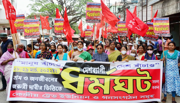 అగర్తలా : ఈ నెల 28, 29 తేదీల్లో అఖిల భారత సమ్మెను జయప్రదం చేయాలని కోరుతూ దేశవ్యాప్తంగా కార్మిక, ప్రజా సంఘాల భారీ ర్యాలీలు, సభలు నిర్వహిస్తున్నారు. త్రిపుర రాజధాని అగర్తలాలో శనివారం భారీ ర్యాలీ నిర్వహించారు. మహిళలు అధిక సంఖ్యలో పాల్గని, సమ్మెను జయప్రదం చేయాలని నినాదాలు చేశారు.