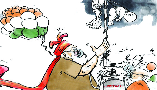 'నూతన భారతదేశం' అనేది హిందూత్వ నిరంకుశవాదం, కార్పొరేట్ నయా పెట్టుబడిదారీవాదం యొక్క విషపూరితమైన కలయికే. 'నూతన భారత' లక్ష్యాన్ని ప్రధాని మోడీ ప్రకటించిన మూడేళ్ళ నుండి కార్పొరేట్ పన్నుల్లో తీవ్రంగా కోత విధించడం చూశాం. బడా కార్పొరేట్లు తీసుకున్న లక్షల కోట్ల రూపాయిల రుణాలను రద్దు చేశారు. పెద్ద ఎత్తున ప్రైవేటీకరణ ద్వారా ప్రభుత్వ రంగాన్ని నాశనం చేయడానికి ప్రణాళికలు రూపొందిస్తున్నారు. వ్యవసాయ వాణిజ్యం లోకి, మార్కెటింగ్లోకి కార్పొరేట్ల ప్రవేశానికి వీలు కల్పిస్తూ తీసుకొచ్చిన మూడు వ్యవసాయ చట్టాలు పార్లమెంట్లో ఆమోద ముద్ర పొందాయి. తీవ్ర అసమానతలు కలిగిన భారతదేశాన్ని సృష్టిస్తున్నారు. క్రెడిట్ సూసె వెల్త్ రిపోర్ట్ 2021 ప్రకారం, టాప్ ఒక శాతం మంది సంపద వాటా 2020 చివరి నాటికి 40.5 శాతం పెరిగింది. 2020లో కోటీశ్వరుల సంఖ్య 102 వుండగా, 2021 నాటికి 140కి చేరుకుందని ఫోర్బ్స్ నివేదిక అంచనా వేసింది. అదే సమయంలో మరో వైపు దుర్భర దారిద్య్రం అనూహ్యమైన స్థాయిల్లో పెరిగిపోయింది. కరోనా మహమ్మారి సమయంలో గ్రామీణ, పట్టణ ప్రాంతాలు రెండింట్లోనూ ఇదే పరిస్థితి నెలకొంది.