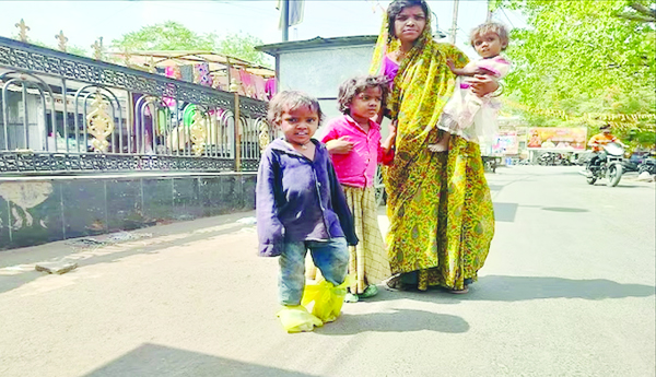 ఎండవేడిని తాళలేక ప్లాస్టిక్ సంచులనే పాదరక్షలుగా చేసుకుని ముగ్గురుబిడ్డలతో నిస్సహాయంగా నుంచొన్న ఈ మహిళ పేరు రుక్మిణి. భర్త టీబీ వ్యాధితో బాధపడడం ఆ కుటుంబానికి అనుకోని ఉపద్రవం. ఈ పరిస్థితుల్లో.. పనిచేసే కుటుంబ పెద్ద మంచాన పడి, బిడ్డల పోషణ భారమైంది. ఆ పిల్లల కడుపు నింపడం కోసం పారిశుధ్య కార్మిక పని వెతుక్కుంటూ ఆమె మిట్ట మధ్యాహ్నం వేళ బయటికి వచ్చింది. తన వెంటే పిల్లలు కూడా బయలుదేరారు. వేడి తట్టుకోలేక చిన్న బిడ్డ అల్లాడుతుంటే చంకనేసుకుంది. మరి మిగిలిన బిడ్డలిద్దరి పరిస్థితి.. రోడ్డు పక్కన వెతికింది. భోజన వ్యర్థాలతో కొన్ని కవర్లు రోడ్డు పక్కనే పడి ఉన్నాయి. వెంటనే వాటిని తీసుకుని బిడ్డల పాదాలకు రక్షణగా చుట్టింది. తాను కూడా మరో కవరు చుట్టుకుంది. ఇంక భయం లేదు.. ఎంత దూరమైనా వెళ్లొచ్చన్న భరోసాతో వడివడిగా రోడ్డుపై నడుస్తోంది.
