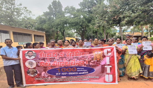 తిరుపతి : ' మీరిచ్చిన హామీలు.. నీటిమూటలేనా ? ' అంటూ ... టిటిడి అటవీ కార్మికులు చేపట్టిన నిరాహార దీక్షలు సోమవారంతో వెయ్యి రోజులకు చేరాయి. ఈ సందర్భంగా ... నిరసనకారులకు మద్దతుగా, తిరుపతి వ్యవసాయ కళాశాల కాంట్రాక్ట్ ఉద్యోగులతో ధర్నా కార్యక్రమం చేపట్టారు. టిటిడి అటవీ కార్మికుల సమస్యల్ని పరిష్కరించాలని డిమాండ్ చేశారు.