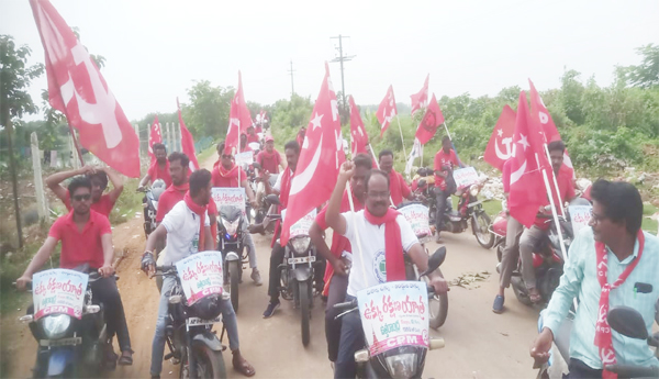 వీరఘట్టం (మన్యం) : విశాఖపట్నం స్టీల్ ప్లాంట్ అమ్మకం నిలిపివేయాలని కోరుతూ ... ఆదివారం వీరఘట్టం గ్రామంలో సిపిఎం ఆధ్వర్యంలో బైక్ ర్యాలీ నిర్వహించారు. నేతలు మాట్లాడుతూ ... విశాఖపట్నం స్టీల్ ప్లాంట్ను అమ్మేయాలని మోడీ ప్రభుత్వం నిర్ణయించిందని తెలుగు ప్రజలు పోరాడి 32 మంది ప్రాణత్యాగాలతో, 16 వేల మంది రైతుల 22 వేల ఎకరాల భూత్యాగ ఫలంతో లక్ష మందికి ఉపాధి కల్పిస్తున్న ప్లాంట్ ను రక్షించుకుని తీరతామని స్టీల్ ప్లాంట్ కార్మికులు, ప్రజలు గత 1000 రోజులకు పైగా పోరాడుతున్నారని తెలిపారు. అయినా కేంద్ర ప్రభుత్వ వైఖరిలో మార్పు లేదన్నారు. విశాఖ స్టీల్ ప్లాంట్ అమ్మకాన్ని నిలిపేయాలని డిమాండ్ చేశారు.