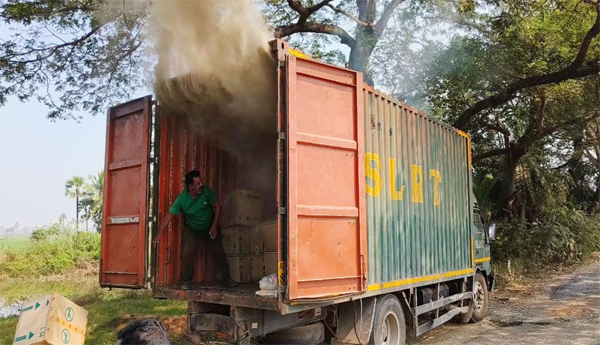 ప్రజాశక్తి-ఉంగుటూరు మండలం (ఏలూరు) : బాదంపూడి నుంచి తాడేపల్లిగూడెంకు వెళ్లే రహదారిలో కంటైనర్ లారీలో అగ్ని ప్రమాదం జరిగింది. ఏలూరు నుంచి గూడెంకు వెళుతున్న లారీలో పొగలు రావటాన్ని నారాయణపూరాణికి చెందిన విశ్రాంత ఆర్మీ బాలు, పైడి వర ప్రసాద్ లు చూసి వెంటనే చెప్పడంతో వాహనదారులు డ్రైవర్ను అప్రమత్తం చేశారు. వెంటనే లారీని పక్కకు పెట్టి తలుపులు తెరిచే చూసేసరికి లోపల పొగ వ్యాపించింది. వాహనంలోని సామగ్రినంతటినీ కిందకి దింపేశారు. వాహనంలో పలురకాల ఔషధాలు, గృహ ఉపయోగ సామాగ్రి పెట్టెలు ఉన్నట్లుగా తెలుస్తోంది. మరింత సమాచారం తెలియాల్సి ఉంది.