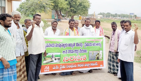 ప్రజాశక్తి-ఒంటిమిట్ట (కడప) : వ్యవసాయ పంపు సెట్లకు విద్యుత్ మీటర్లు పెడితే తీవ్రస్థాయిలో అడ్డుకుంటామని ఏపీ రైతు సంఘం కడప జిల్లా ప్రధాన కార్యదర్శి బి.దస్తగిరి రెడ్డి జిల్లా వ్యసాయ కార్మిక ఉపాధ్యక్షుడు కోనేటి నరసయ్య కేంద్ర రాష్ట్ర ప్రభుత్వాలను హెచ్చరించారు. ఏపీ రైతు సంఘం ఒంటిమిట్ట మండల కమిటీ ఆధ్వర్యంలో సోమవారం నిరసన కార్యక్రమం జరిగింది. ఈ కార్యక్రమానికి ముఖ్య అతిథులుగా హాజరైన నేతలు మాట్లాడుతూ ... వ్యవసాయ పంపుసెట్లకు రాష్ట్ర వ్యాప్తంగా మీటర్లను ఏర్పాటు చేయాలని రాష్ట్ర ముఖ్యమంత్రి వైఎస్ జగన్మోహన్ రెడ్డి తీసుకున్న నిర్ణయాన్ని ఉపసంహరించుకోవాలన్నారు. కేంద్ర ప్రభుత్వం ఆదేశాల మేరకు రాష్ట్ర ప్రభుత్వం మీటర్లు బిగించి బిల్లులు వసూలు చేయడం రైతులకు నష్టందాయకమని చెప్పారు. రైతు సోదరులందరు దీన్ని వ్యతిరేకించాలని పిలుపునిచ్చారు. వ్యవసాయదారులకు ఇప్పటికే పెరిగిన విత్తనాలు, ఎరువులు, పురుగుమందులు డిజల్ ధరలతో వ్యవసాయమే కష్టంగా మారిందని... ఈ సమయంలో పంపుసెట్లకు మీటర్లు బిగించి బిల్లులు వసూలు చేయడం సరైంది కాదని ఆవేదన వ్యక్తం చేశారు. పొరుగు రాష్ట్రాలైన తెలంగాణ, తమిళనాడుల్లో పంపుసెట్లకు మీటర్లను అక్కడి ప్రభుత్వాలు వ్యతిరేకించాయని, ఎపిలో ప్రభుత్వం అంగీకరించడం దురదృష్టకరమని ఆగ్రహాన్ని వ్యక్తం చేశారు. భవిష్యత్తులో దేశం మొత్తం విద్యుత్ పంపిణీని ప్రైవేటీకరించడానికి కేంద్ర ప్రభుత్వం ఆర్డినెన్స్ కూడా తీసుకొచ్చింది అని అన్నారు. ఈ సమయంలో విద్యుత్ మీటర్లు పెట్టడం ద్వారా భవిష్యత్తులో విద్యుత్ రంగం ప్రైవేటుపరం అయినప్పుడు కంపెనీ ఇష్టాలకు రైతాంగాన్ని బలి చేయడమే అవుతుందని వాపోయారు. రాష్ట్ర ప్రభుత్వం చెల్లిస్తామని చెబుతున్నారని అలాంటప్పుడు మీటర్ల ఖర్చు ఎందుకని ప్రశ్నించారు. వ్యవసాయ పంపుసెట్లకు రాష్ట్ర వ్యాప్తంగా మీటర్లను ఏర్పాటు చేయాలని రాష్ట్ర ముఖ్యమంత్రి వైఎస్ జగన్మోహన్ రెడ్డి తీసుకున్న నిర్ణయాన్ని ఉపసంహరించుకోవాలని డిమాండ్ చేశారు.
