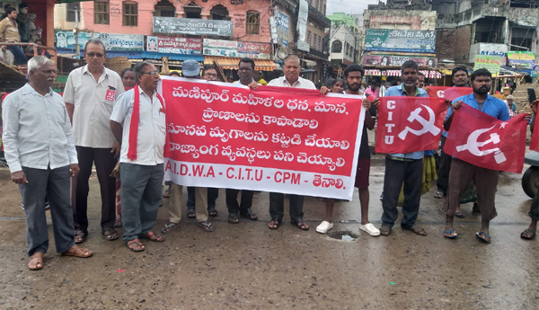కొల్లిపర మండల కేంద్రంలో మణిపూర్లో అల్లర్లకు నిరసనగా ప్రజా సంఘాలు, సిపిఎం, సిఐటియు సంయుక్తంగా నిరసన ర్యాలీ నిర్వహించాయి. ఈ సందర్భంగా రైతు సంఘం జిల్లా ఉపాధ్యక్షులు ములక శివసాంబి రెడ్డి మాట్లాడుతూ.. మణిపూర్ ముఖ్యమంత్రిని వెంటనే పదవి నుంచి భర్తరఫ్ చేయాలని డిమాండ్ చేశారు. రాష్ట్రంలోని ప్రధాన పార్టీలు అయిన వైసిపి, టిడిపి, జనసేన కూడా మణిపూర్ అల్లర్లపై పెదవి విప్పకపోవడం వెనక ఆంతర్యం ఏమిటని ప్రశ్నించారు. కేంద్ర ప్రభుత్వం తక్షణమే జోక్యం చేసుకొని పరిస్థితిని చక్కదిద్దాలని కోరారు. కార్యక్రమంలో సిఐటియు నాయకులు కోట చంద్రశేఖర్, ఏఐటీయూసీ నాయకులు బాలస్వామి, రైతు సంఘ నాయకులు ఎం సాంబశివరావు, అంగన్వాడి వర్కర్స్ యూనియన్ నాయకులు మల్లోల రమేష్, జి.సుందర్రావు తదితరులు పాల్గొన్నారు.
