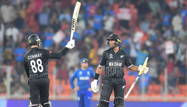 అహ్మదాబాద్: వన్డే ప్రపంచకప్ న్యూజిలాండ్ జట్టు అద్భుత విజయాన్ని సొంతం చేసుకుంది. డిఫెండింగ్ ఛాంపియన్ ఇంగ్లండ్ జట్టు నిర్దేశించిన 283పరుగుల లక్ష్యాన్ని యంగ్(0) వికెట్ కోల్పోయి ఛేదించింది. కాన్వే(152నాటౌట్; 121బంతుల్లో 19ఫోర్లు, 3సిక్సర్లు), రచిన్ రవీంద్ర(123నాటౌట్; 96బంతుల్లో 11ఫోర్లు, 5సిక్సర్లు) ఇంగ్లండ్ బౌలర్లకు చుక్కలు చూపించారు. న్యూజిలాండ్ 25 ఓవర్లు పూర్తయ్యేసరికి ఒక వికెట్ కోల్పోయి 187పరుగులు చేసింది. ఆ తర్వాత కాన్వే, రవీంద్ర అజేయ శతకాలతో కదం తొక్కడంతో న్యూజిలాండ్ జట్టు 36.2ఓవర్లలోనే లక్ష్యాన్ని ఛేదించింది. అంతకుముందు టాస్ ఓడి తొలిగా బ్యాటింగ్కు దిగిన ఇంగ్లండ్ నిర్ణీత 50ఓవర్లలో 9 వికెట్ల నష్టానికి 282 పరుగులు చేసింది. ఇంగ్లాండ్ బ్యాటర్లలో జో రూట్ (77; 86బంతుల్లో 4ఫోర్లు, సిక్సర్) అర్ధ శతకం బాదాడు. జోస్ బట్లర్ (43; 42బంతుల్లో 2 ఫోర్లు, 2సిక్సర్లు) రాణించాడు. హెన్రీకి మూడు, సాంట్నర్, ఫిలిప్స్కు రెండేసి వికెట్లు దక్కాయి.