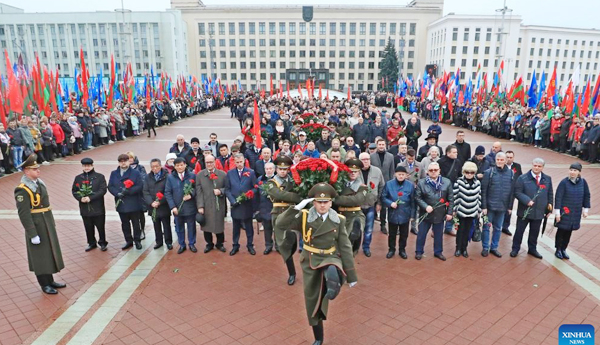 బెలారస్: 1917 అక్టోబర్ మహా విప్లవ 105వ వార్షికోత్సవాన్ని పురస్కరించుకుని సోమవారం బెలారస్ రాజధాని మిన్స్క్లో లెనిన్ విగ్రహం వద్ద కవాతు చేస్తున్న సైన్యం. ఈ కార్యక్రమంలో ప్రజలు పెద్ద సంఖ్యలో పాల్గొన్నారు. .