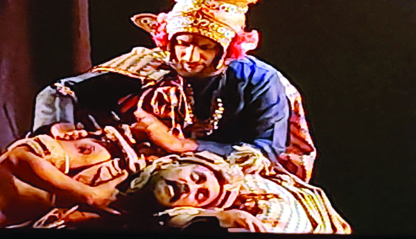 ధృతరాష్ట్రుడికి సంజయుడు యుద్ధక్షేత్ర దృశ్యాలను వివరించాడన్నదాన్ని సంకేతిస్తూ, సమాచార సాధనం (రేడియో/ ఆకాశవాణిని) పట్టుకొని ఉంటాడు. పిండి కొద్దీ రొట్టె అన్నట్లు ప్రొడక్షన్ రిచ్గా కాస్ట్యూమ్స్, సెట్ ప్రాపర్టీస్ ఖర్చుకు వెనకాడలేదని కళ్ళకు కొట్టొచ్చినట్లు కనిపిస్తుంది. ఏ వస్తువునైనా రంగస్థలంపై సృజనాత్మక భావచైతన్యంతో కళారూపంలోకి అనువదించవచ్చునన్న 'ఆభాస' అడుగడుగునా కనిపిస్తుంది, ఈ నాటకంలో.