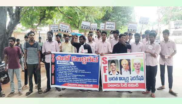 ఏలూరు : నూతన విద్యా విధానాన్ని రద్దు చేయాలని డిమాండ్ చేస్తూ ... ఎస్ఎఫ్ఐ ఆధ్వర్యంలో చలో కలెక్టరేట్ ను సోమవారం నిర్వహించారు. ఏలూరు కలెక్టరేట్ వద్ద విద్యార్థులు ప్లకార్డులను పట్టుకొని ధర్నా చేపట్టారు. నూతన విద్యా విధానాన్ని రద్దు చేయాలని, పెండింగ్లో ఉన్న పాఠ్యపుస్తకాలను వెంటనే అందించాలని, హాస్టల్ విద్యార్థులకు మెస్ చార్జీలు, కాస్మొటిక్ చార్జీలను పెంచాలని, ఇతర విద్యారంగ సమస్యలను పరిష్కరించాలని డిమాండ్ చేశారు.