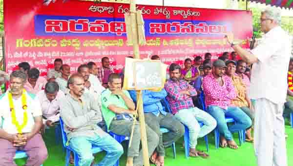 64వ వార్డు కార్పొరేటర్ దల్లి గోవిందరెడ్డి మాట్లాడుతూ, అదాని గంగవరం పోర్టు యాజమాన్యం కార్మికుల సమస్యలు పరిష్కరించకుండా సమస్యను జఠిలం చేస్తోందన్నారు. నిర్వాసిత కార్మికులకు కనీస జీతం రూ.36 వేలు ఇవ్వాలని, బేసిక్లో డిఎ మెర్జ్ చేసి కొత్త బేసిక్ రూ.22 వేలుగా ప్రకటించాలని డిమాండ్చేశారు. కార్మికుల న్యాయమైన సమస్యలు పరిష్కారమయ్యేవరకూ ఉద్యమాన్ని కొనసాగించాలని కోరారు. అక్రమంగా తొలగించిన కార్మికులను వెంటనే విధుల్లోకి తీసుకోవాలని డిమాండ్ చేశారు. ఈ కార్యక్రమంలో ప్రగతిశీల కార్మిక సమాఖ్య రాష్ట్ర కార్యదర్శి కొండారెడ్డి అన్నపూర్ణ, భారత్ బచావో జిల్లా కార్యదర్శి డాక్టర్ పొన్నాడ శ్రీనివాస్, గంగవరం పోర్టు ఎంప్లాయీస్ యూనియన్ ఉపాధ్యక్షులు కొవిరి అప్పలరాజు, ప్రధాన కార్యదర్శి నొల్లి తాతారావు, ట్రెజరర్ వాసుతిల్లి ఏల్లాజీ, ఉమ్మడి అప్పారావు, గంటపిల్లి అమ్మోరు, మాద అప్పారావు, కదిరి సత్యానందం పేర్ల నూకరాజు, నోళ్లు స్వామి, గంటిపిల్లి లక్ష్మయ్య తదితరులు పాల్గొన్నారు.