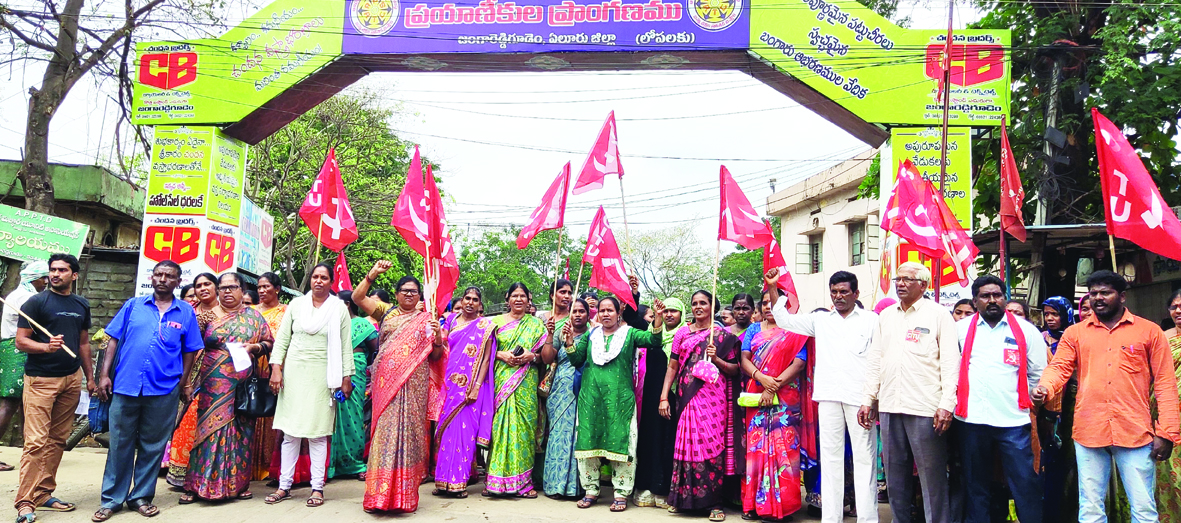 తమ సమస్యల పరిష్కారం కోరుతూ చలో విజయవాడ కార్యక్రమం చేపట్టిన అంగన్వాడీలపై రాష్ట్ర ప్రభుత్వం పోలీసు నిర్బంధంతో ఉక్కుపాదం మోపింది. జిల్లా నలుమూలల నుండి విజయవాడ వెళ్లేందుకు బస్సులు, రైళ్లు, ప్రయివేటు వాహనాల్లో బయల్దేరిన అంగన్వాడీలను జాతీయ రహదారిపై కలపర్రు టోల్గేట్ వద్ద బలవంతంగా వాహనాలు దింపి పెదపాడు పోలీస్ స్టేషన్, ఏలూరు రూరల్ పోలీస్ స్టేషన్, సీతారంభర్తియా కళ్యాణ మండపం తదితర ప్రాంతాలకు తరలించారు. దాదాపు 500 మంది అంగన్వాడీలనూ అక్రమంగా అరెస్టు చేసి నిర్బంధించారు. ఈ అరెస్టులు, నిర్బంధానికి వ్యతిరేకంగా అంగన్వాడీలు ఆయా స్టేషన్ల ముందు, మర్చంట్ ఛాంబర్ కార్యాలయం ముందు పెద్దఎత్తున తమ నిరసన తెలిపారు. అక్రమ అరెస్టులను నిరసిస్తూ సిఐటియు, ప్రజాసంఘాలు ఆధ్వర్యాన చేపట్టిన ఆందోళనకు సిపిఎం మద్దతు ప్రకటించింది. ఏలూరు రూరల్ పోలీస్ స్టేషన్ నుండి భర్తియాఛాంబర్ కళ్యాణ మండపం వరకు ర్యాలీ నిర్వహించారు. అరెస్ట్ చేసిన వారిని విడుదల చేయాలంటూ అక్కడే రోడ్డుపై పడుకుని వినూత్నరీతిలో నిరసన తెలిపారు. ఈ కార్యక్రమానికి సిపిఎం నగర కార్యదర్శి పి.కిషోర్, సిఐటియు నగర అధ్యక్ష కార్యదర్శులు బి.జగన్నాధరావు, వి.సాయిబాబు, ఆటోవర్కర్స్ యూనియన్ జిల్లా కార్యదర్శి జె.గోపీ, ఎస్ఎఫ్ఐ జిల్లా కార్యదర్శి లెనిన్, మెడికల్ రిప్స్ రాష్ట్ర నాయకులు ప్రసాద్, మున్సిపల్ వర్కర్స్ యూనియన్ జిల్లా కార్యదర్శి జాన్బాబు, అంగన్వాడీ యూనియన్ ఏలూరు ప్రాజెక్టు అధ్యక్షురాలు రజిని, జిల్లా నాయకులు పిఎల్ఎస్.కుమారి, తదితరులు నాయకత్వం వహించారు.