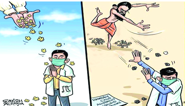 కరోనా మహమ్మారి రెండో విడత వస్తోందని తెలిసికూడా కావాలనే దానిని నిర్లక్ష్యం చేసి కార్పొరేట్ సంస్థలకు దేశ సంపదను దోచిపెట్టడంలోను, తమ రాజకీయ అధికారాన్ని ఎలాగైనా విస్తరింపజేసుకునే ప్రయత్నాలలోను మునిగిపోయింది బిజెపి. ఈ నిర్లక్ష్యం దేశ ప్రజలకు ప్రాణాంతకం అయింది. ప్రపంచం మొత్తానికే అవసరమైన వ్యాక్సిన్ ను ఉత్పత్తి చేయగల సామర్ధ్యం ఉండిన మన దేశం ఈనాడు తన స్వంత ప్రజలలో కనీసం పది శాతానికి కూడా వ్యాక్సిన్ అందించలేకపోయింది. చివరకు ఆక్సిజన్ కూడా కరువైంది. ఇదంతా మోడీ ప్రభుత్వ వైఫల్యమేనని ప్రపంచం అంతా దుమ్మెత్తి పోస్తోంది. ఈ ఇరకాటం నుండి బైటపడడానికి సంఘపరివారం ప్రతివ్యూహం పన్నింది. దోషమంతా జాగ్రత్తలు పాటించని ప్రజలదేనని, కాకపోతే రాష్ట్ర ప్రభుత్వాల వైఫల్యమని, ఇలా నిరాధారంగా ఎదురుదాడి చేసి తప్పించుకోజూస్తున్నది. మొదటి విడత కరోనా వచ్చినప్పుడు ఇదంతా చైనా కుట్ర అని, తబ్లిగి జమాత్ వల్లనే వ్యాపించింది అని చెప్పి అప్పటి నిర్లక్ష్యాన్ని కప్పిపుచ్చుకునే తప్పుడు ప్రచారానికి పాల్పడిన మోడీ పరివారం ఇప్పుడు అదే ప్రచార వ్యూహంతో వ్యవహరిస్తోంది. కాకపోతే కేంద్రం వైఫల్యం ఈసారి మరీ కొట్టవచ్చినట్టు కనిపిస్తోంది. ఆక్సిజన్ సరఫరా, వ్యాక్సిన్ ల కొరత విషయంలో సుప్రీం కోర్టు కూడా మోడీ ప్రభుత్వాన్ని తప్పుబట్టింది. వ్యాక్సిన్ బాధ్యత కేంద్రానిదేనని తేల్చింది. ఇటువంటి పరిస్థితుల్లో ఏకంగా అల్లోపతి వైద్యమే విఫలం అయిందన్న ప్రచారం చేస్తే ఇక వ్యాక్సిన్ ల గురించి చర్చ పక్కకు పోతుంది కదా.