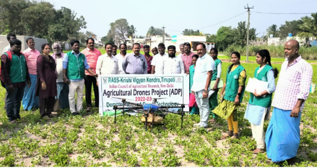 ప్రజాశక్తి-పిచ్చాటూరు : రాస్ కృషి విజ్ఞాన కేంద్రం శుక్రవారం తిరుపతి వారు పిచ్చాటూరు మండలంలోని అప్పంబట్టు గ్రామంలో వ్యవసాయంలో డ్రోన్ లు ఉపయోగించి పురుగుమందుల పిచికారీపై అవగాహన కల్పించి ప్రదర్శన నిర్వహించినట్లు కేంద్ర సీనియర్ శాస్త్రవేత్త మరియు హెడ్ డా ఎస్.శ్రీనివాసులు తెలిపారు. జిల్లా వ్యవసాయ అధికారి ఎస్.ప్రసాద్ రావు, ఉప సంచాలకులు ధనుంజయ రెడ్డి ముఖ్య అతిథిలుగా హాజరు కాగా మండల స్థాయి వ్యవసాయ అధికారులు కార్యక్రమంలో పాల్గొన్నారు. జిల్లా వ్యవసాయ అధికారి ఎస్.ప్రసాదరావు మాట్లాడుతూ వ్యవసాయంలో నూతన సాంకేతికత వినియోగించటం వలన రైతులు శ్రమ తగ్గి మంచి ఆదాయం సాధ్యం అవుతుందని, కూలీల కొరత ప్రధాన సమస్యగా ఉన్న ప్రస్తుత కాలంలో రైతులు తప్పనిసరిగా వ్యవసాయ యాంత్రీకరణ వైపుగా ఆలోచించి ముందుకు సాగాలని తెలిపారు. రాస్ కృషి విజ్ఞాన కేంద్రం, సీనియర్ శాస్త్రవేత్త మరియు హెడ్ డా.ఎస్.శ్రీనివాసులు మాట్లాడుతూ చిత్తూరు మరియు తిరుపతి జిల్లాలకు సంబంధించి భారతీయ వ్యవసాయ పరశోధనా మండలి, న్యూ ఢిల్లీ వారు వ్యవసాయ డ్రోన్ ల వినియోగాన్ని రైతులకు చేరవేయడానికి రాస్ కృషి విజ్ఞాన కేంద్రంను ఎంపిక చేయటం జరిగిందని, ఈ ప్రాజెక్ట్ లో భాగంగా జిల్లాలోని వివిధ మండలాలలో రైతు పొలాలలో డ్రోన్ వినియోగించి ప్రదర్శనా క్షేత్రాలు నిర్వహించటం జరుగుతుందని ఆయన తెలిపారు. ఈ సాంకేతికత గురించి ఆయన మాట్లాడుతూ డ్రోన్ వినియోగించి పిచికారీ ద్వారా నీరు, పురుగుమందు, కూలీల ఖర్చుతో పాటు సమయం కూడా ఆదా అవుతుందని, మామూలు పద్దతి కన్నా ఈ పద్ధతిలో పురుగుమందు ప్రభావం బాగా ఉంటుందని రైతులు ఈ నూతన సాంకేతికతను వినియోగించుకోవాలని అన్నారు. కార్యక్రమంలో తరువాత గ్రామంలో 30 ఎకరాల వేరుశెనగ పంటలలో డ్రోన్ వినియోగించి పురుగుమందు పిచికారీ పై ప్రదర్శన నిర్వహించారు. ఈ కార్యక్రమంలో జిల్లా వ్యవసాయ అధికారి ఎస్.ప్రసాదరావు, వ్యవసాయ ఉప సంచాలకులు ధనుంజయ రెడ్డి, వ్యవసాయ సహా సంచాలకులు రమేష్ రెడ్డి, రైతు శిక్షణా కేంద్ర వ్యవసాయ అధికారిని శ్రీమతి సరళ, మండల వ్యవాయాధికారి సంజీవ రెడ్డి, కే.వి.కే సీనియర్ శాస్త్రవేత్త మరియు హెడ్ డా.ఎస్.శ్రీనివాసులు, శాస్త్రవేత్త రాము కుమార్, ఆయా సచివాలయం గ్రామ వ్యవసాయ సహాయకులు మరియు గ్రామ రైతులు పాల్గొన్నారు.