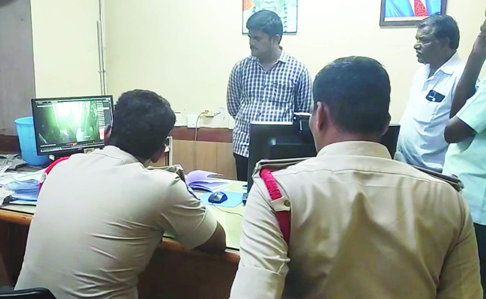 బ్యాంకులో సిసి ఫుటేజీని పరిశీలిస్తున్న సిఐ వెంకటేశ్వర్లు, ఎస్ఐ నాయక్