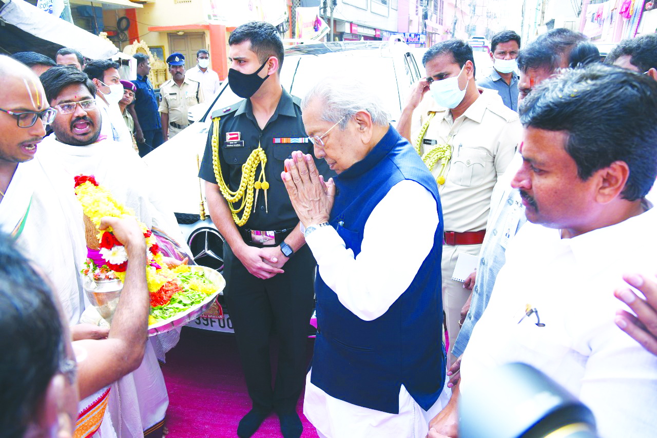ప్రజాశక్తి - వన్టౌన్: విఫ్రా ఫౌండేషన్ వారి ఆధ్వర్యంలో నిర్వహించిన అమత్ భారత్ రథయాత్ర కాంచీపురం నుండి ప్రారంభమై ఆంధ్రప్రదేశ్లోని వన్టౌన్ బ్రాహ్మణ వీధిలోని శ్రీ వెంకటేశ్వర్ స్వామి వారి దేవాలయం వద్దకు మంగళవారం చేరుకుంది. ఈ సందర్భంగా రాష్ట్ర గవర్నర్ బిశ్వ భూషణ్ హరిచందన్కు మాజీ మంత్రి, విజయవాడ పశ్చిమ శాసన సభ్యులు వెలంపల్లి శ్రీనివాసరావు స్వాగతం పలికి సత్కరించారు. అనంతరం రథయాత్రకు స్వాగతం పలికారు. బ్రాహ్మణ వీధిలోని శ్రీ వెంకటేశ్వర స్వామి దేవాలయం ఇఓ గెల్లి హరిగోపీనాథ్ బాబు, వేదపండితులతో కలిసి గవర్నర్ విశ్వ భూషణ్ హరిచందన్, ఎమ్మెల్యే వెలంపల్లికి పూర్ణకుంభంతో స్వాగతం పలికారు. అరుణాచల్ ప్రదేశ్లోని లోహిత నది మీద విఫ్రా ఫౌండేషన్ మరియు భారత ప్రభుత్వంచే రూ. 51 కోట్ల నిధులతో 51 అడుగుల శ్రీ పరుశురాముని విగ్రహం నిర్మించనున్న సందర్భంగా దేశంలోని అన్ని ప్రాంతాల ప్రజలను ఆహ్వానిస్తూ నిర్వహించిన యాత్ర పరశురామ కుండ్ అమంత్రన్ యాత్రలో భాగమే అమత్ భారత్ రథయాత్ర అని నిర్వాహకులు తెలిపారు.