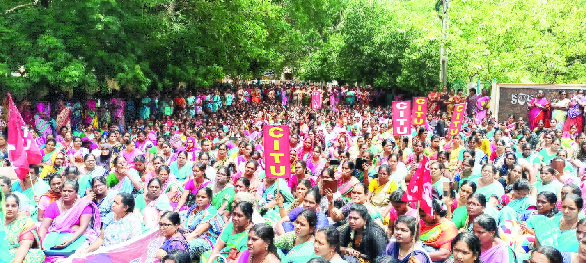 అంగన్వాడీల న్యాయమైన సమస్యలు పరిష్కరించాలని కోరుతూ చేపట్టిన 36 గంటల ధర్నా ఏలూరు కలెక్టరేట్ వద్ద తీవ్ర ఉద్రిక్తతకు దారితీసింది. ఎపి అంగన్వాడీ వర్కర్స్ అండ్ హెల్పర్స్ యూనియన్ (సిఐటియు) జిల్లా కమిటీ ఆధ్వర్యంలో జరిగిన మహాధర్నాకు ఏలూరు జిల్లా నలుమూలల నుండి వేలాది మంది అంగన్వాడీలు తరలివచ్చారు. గత 36 గంటలుగా కలెక్టరేట్ వద్ద బైఠాయించి పెద్దఎత్తున ఆందోళన చేపట్టారు. సోమవారం రాత్రి కలెక్టరేట్ వద్ద నిద్రించి వర్షంలో తడుస్తూనే తమ నిరసన కొనసాగించారు. అయినప్పటికీ అధికారులు, ప్రభుత్వం స్పందించకపోవడంతో అంగన్వాడీల్లో తీవ్ర ఆగ్రహం వ్యక్తమైంది. దీంతో కలెక్టరేట్ను ముట్టడించారు. కలెక్టరేట్ రోడ్డులో ఏర్పాటు చేసిన పోలీసు వలయాన్ని ఛేదించుకుని, బారికేడ్లను తోసుకుంటూ కలెక్టర్ కార్యాలయం ప్రధాన గేటు వద్దకు చేరుకుని అక్కడ బైఠాయించారు. వేలాదిమంది అంగన్వాడీలు అక్కడకు చేరుకుని సమస్యలపై నినదించడంతో కలెక్టరేట్ ప్రాంగణమంతా దద్దరిల్లింది. జిల్లా అధికారులు వచ్చి తమ సమస్యలపై స్పందించే వరకూ కదిలేదిలేదని భీష్మించారు. ఈ సందర్భంగా అంగన్వాడీలు తమ న్యాయమైన డిమాండ్లను పరిష్కరించాలని, కనీస వేతనం రూ.26 వేలు ఇవ్వాలని, రాజకీయ వేధింపులు అరికట్టాలని, సుప్రీంకోర్టు తీర్పును అనుసరించి గ్రాడ్యుటీ ఇవ్వాలని, అంగన్వాడీలను ప్రభుత్వ ఉద్యోగులుగా గుర్తించాలని, సంక్షేమ పథకాలు అమలు చేయాలని పెద్దపెట్టున నినదించారు. అంగన్వాడీల ఆందోళనకు స్పందించిన జిల్లా రెవెన్యూ అధికారి సత్యనారాయణ మూర్తి అంగన్వాడీల వద్దకు వచ్చి వినతిపత్రం తీసుకున్నారు. అంగన్ వాడీల సమస్యల పరిష్కారానికి రాష్ట్ర ప్రభుత్వం దృష్టికి తీసుకువెళ్తామని హామీ ఇచ్చారు.