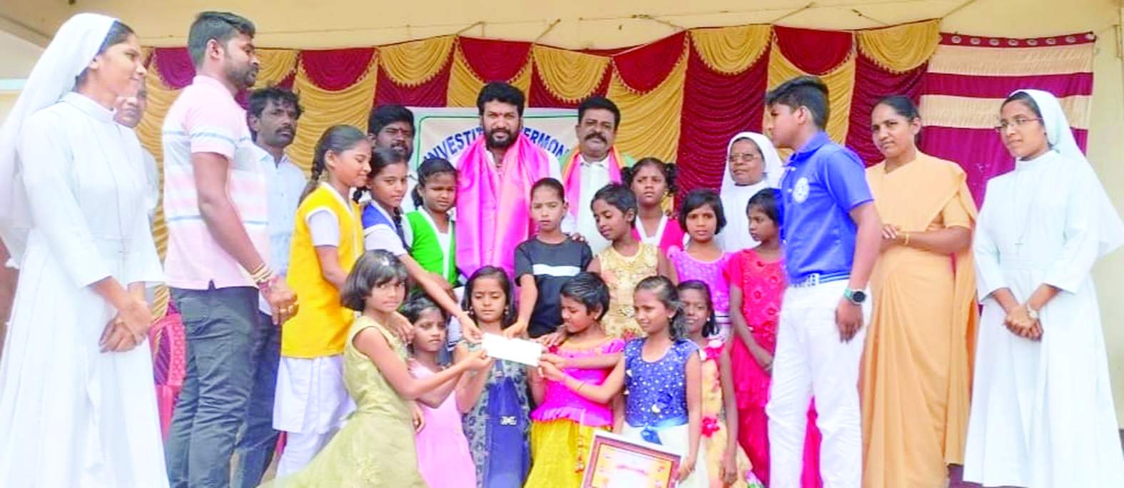 అనాథ బాలలకు రూ. 50 వేల చెక్కును అందజేస్తున్న గుమ్మనూరు నారాయణ