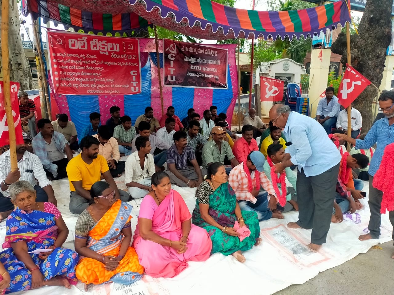 ప్రజాశక్తి-సత్తెనపల్లి:మున్సిపల్ కాంట్రాక్ట్ కార్మికులకు కనీస వేతనం రూ.26 వేలు ఇవ్వాలని, ముఖ్యమంత్రి ఎన్నికలకు ముందు ఇచ్చిన హామీ ప్రకారం కాంట్రాక్ట్, ఔట్సోర్సింగ్ కార్మికులందరినీ పర్మినెంట్ చేయాలని సిఐటియు పల్నాడు జిల్లా ప్రధాన కార్యదర్శి ఎస్ ఆంజనేయ నాయక్ ప్రభుత్వాన్ని డిమాండ్ చేశారు. రెండవ రోజు రిలే దీక్షలను పూలదండలు వేసి ప్రారంభించారు. ముగింపు కార్యక్రమంలో నాయకులకు నిమ్మరసం ఇచ్చి దీక్షలు విరమింప చేశారు. కార్యక్రమంలో సిఐటియు పట్టణ నాయకులు రొంపిచర్ల పురుషోత్తం, మామిడి జగన్నాధ రావు, చింతకుంట్ల పెద్ద వెంకయ్య, మున్సిపల్ వర్కర్స్ పాల్గొన్నారు.