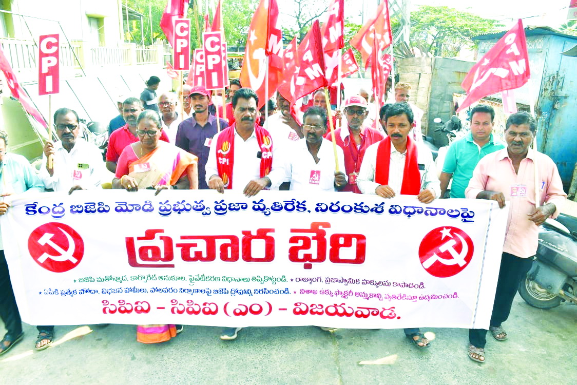 ప్రజాశక్తి-భవానీపురం: కేంద్రంలోని బిజెపి పాలనలో దేశ భవిష్యత్తు అంథకారంగా మారిందని సిపిఐ నగర కార్యదర్శి జి.కోటేశ్వరరావు, సిపిఎం పశ్చిమ సిటీ కార్యదర్శి బోయి సత్యబాబు అన్నారు. సిపిఐ, సిపిఎం ఆధ్వర్యంలో నిర్వహిస్తున్న ప్రచారభేరి కార్యక్రమంలో మంగళవారం భవానీపురం బ్యాంక్ సెంటరు వద్ద నిర్వహించారు. ఈ సందర్భంగా వారు మాట్లాడుతూ కేంద్రంలోని నరేంద్ర మోడీ ప్రభుత్వం రాజ్యాంగం ఇచ్చిన హక్కులకు తూట్లు పొడుస్తుందన్నారు. ప్రశ్నించే వారి గొంతు నొక్కుతున్నారన్నారు. పార్లమెంట్లో అదానీ అంశంపై సమాధానం చెప్పమన్నందుకు రాహుల్ గాంధీ పార్లమెంట్ సభ్యత్వం రద్దు చేయడంతో పాటు, నివాసం కూడా ఖాళీ చేయటం దుర్మార్గమని ధ్వజమెత్తారు. ప్రజా సంపదను కార్పొరేట్లకు కారుచౌకగా కట్టబెడుతున్నారన్నారు. ఈ కార్యక్రమంలో సిపిఐ నాయకులు పంచదార్ల దుర్గాంబ, కొట్టు రమణారావు, తూనం వీరయ్య, బుద్దే రాజ, ఓర్సు భారతి, చింతాడ పార్వతి, దుర్గాసి రమణమ్మ, డి పుష్ప, ఎం.సాయికుమార్, టి.పూర్ణయ్య, బి.రవి కుమార్, ఏర్రసాని జొసఫ్, రంగారావు, సిపిఎం నాయకులు ఇ.వి.నారాయణ, ఎస్.సుబ్బారెడ్డి, బి.అచేశ్వరావు, శంకర్, కె. సూరిబాబు, కష్ణారెడ్డి, వెంకట్రావు (చౌదరి), మురళి తదితరులు పాల్గొన్నారు.