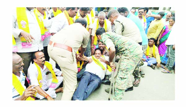 సాలూరు: మాజీ సిఎం చంద్రబాబు నాయుడు అరెస్టుకు నిరసనగా మాజీ ఎమ్మెల్యే ఆర్పీ భంజ్ దేవ్ ఆధ్వర్యాన టిడిపి నాయకులు కార్యకర్తలు వెంకటేశ్వరా డీలక్స్ సెంటర్లో జాతీయ రహదారిపై రాస్తారోకో నిర్వహించారు. దీంతో సిఐ శ్రీనివాసరావు ఆధ్వర్యాన పోలీసులు అక్కడకు చేరుకుని సెక్షన్ 30 అమల్లో ఉన్న కారణంగా సామూహిక నిరసన, ఆందోళన కార్యక్రమాలు చేయరాదని చెప్పారు. ఆందోళనకారులను రోడ్డుపై నుంచి లాక్కుని వెళ్లారు. కార్యక్రమంలో టిడిపి మండల అధ్యక్షులు ఎ.పరమేష్,మాజీ అధ్యక్షులు చోడవరపు గోవింద రావు, పట్టణ నాయకులు కొనిసి చిన్ని,పప్పల మోహనరావు పాల్గొన్నారు. అలాగే నియోజకవర్గ ఇన్చార్జి సంధ్యారాణి ఆధ్వర్యాన టిడిపి నాయకులు, కార్యకర్తలు నిరసన ర్యాలీ నిర్వహించారు. చంద్రబాబు అరెస్టు అక్రమమని, సిఎం డౌన్ డౌన్ అంటూ నినాదాలు చేశారు. కార్యక్రమంలో టిడిపి పట్టణ అధ్యక్షుడు నిమ్మాది తిరుపతిరావు,మాజీ కౌన్సిలర్ అప్పయ్యమ్మ పాల్గొన్నారు.