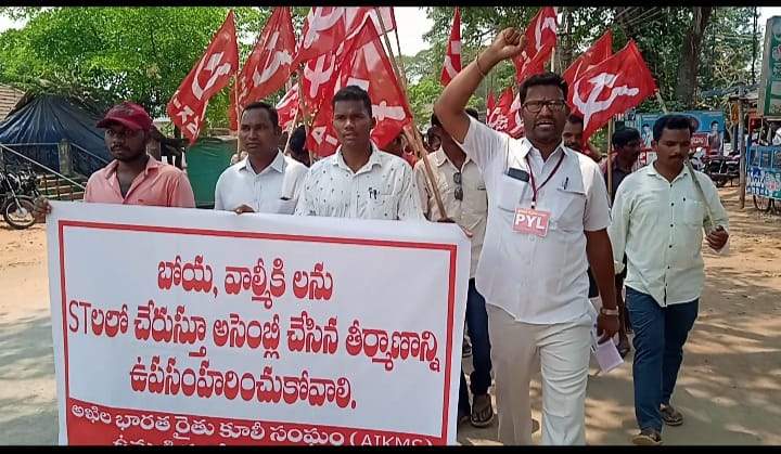 బుట్టాయగూడెం : బోయ, వాల్మీకులను ఎస్టిలో జాబితాలో చేర్చొద్దంటూ అఖిల భారత రైతు కూలీ సంఘం, అఖిలభారత ఆదివాసీ ఐక్యవేదిక ఆధ్వర్యంలో స్థానిక తహశీల్దార్ కార్యాలయం ముందు సోమవారం ధర్నా నిర్వహించారు. తొలుతస్థానిక పార్టీ కార్యాలయం రావ నరసయ్య భవనం నుండి ప్రారంభమైన ర్యాలీ బస్టాండ్, నెహ్రూ సెంటర్ మీదుగా తిరిగి తహశీల్దార్ కార్యాలయానికి చేరింది. తహశీల్దార్ ఎస్ఎస్.శాంతికి వినతిని అందజేశారు. ఈ సందర్భంగా రైతు కూలీ సంఘం రాష్ట్ర సహాయ కార్యదర్శి డి.సురేష్ మాట్లాడారు. ఈ ర్యాలీలో కట్టం నాగేశ్వరరావు, నడపాల రాజు, కరకాల రామిరెడ్డి, కె.రాజు, మల్లం పెంటయ్య, కోరం దుర్గారావు, కోరం భీమన్న, గంగిరెడ్డి, గుజ్జు రమేష్బాబు, పండు ధర్మరాజు పాల్గొన్నారు.