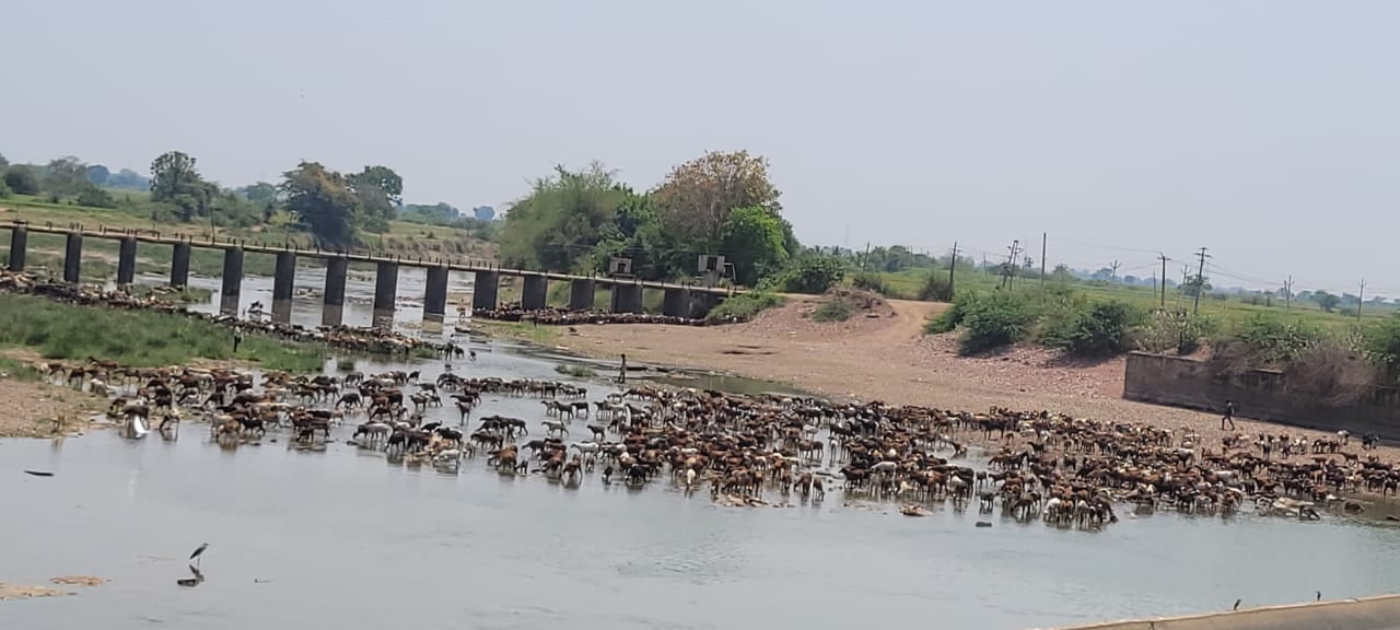కుందూ నదిలో దాహం తీర్చుకుంటున్న మూగజీవాలు