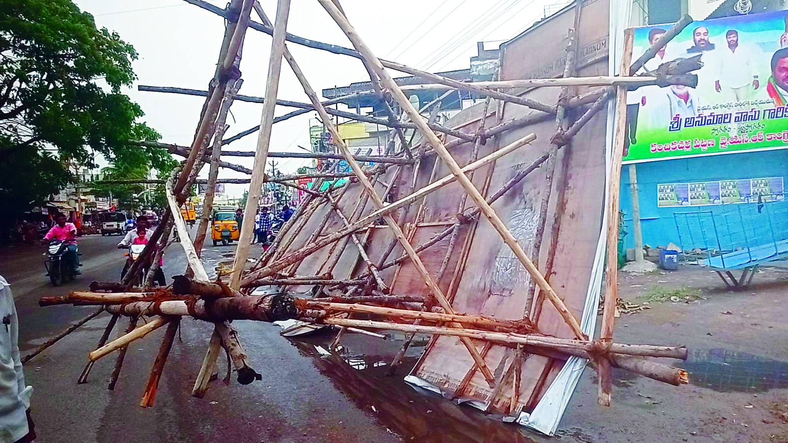 ప్రజాశక్తి-కంచికచర్ల: కంచికచర్ల మండలంలో శుక్రవారం మధ్యాహ్నం ఉరుములు మెరుపులతో కూడిన భారీ వర్షం కురిసింది. ఈదురు గాలులు బలంగా వీయడంతో పలుచోట్ల చెట్లు నేలకొరిగాయి. డ్రైన్లలో నీరు పారుదల కాక రోడ్లపైకి చేరింది. మండల పరిధిలో సాగు చేసిన మునగతోటలు వాలి కాయలు రాలిపోవడమే కాకుండా మునగకాయలకు మంగు సోకినట్లు రైతులు వాపోయారు. కల్లాల్లో ఆరబోసిన మిర్చి పంట తడవకుండా రైతులు హడావుడిగా పట్టాలు కప్పారు. స్థానిక ఆర్టీసీ బస్టాండ్ సమీపంలో జాతీయ రహదారి పక్కన ఓ ప్రజాప్రతినిధి పుట్టిన రోజు సందర్భంగా ఏర్పాటు చేసిన 40 అడుగుల భారీ కటౌట్ ఈదురుగాలులకు పడిపోయింది. ఈ సమయంలో ఎవరూ లేకపోవడంతో పెనుప్రమాదం తప్పింది. కంచికచర్లలో డ్రైన్లలో నీరు పారుదల కాక నెహ్రూ విగ్రహం వద్ద ప్రధాన రహదారిపై మూడు అడుగుల మేర నీరు ప్రవహించింది. ప్రజాశక్తి-వత్సవాయి: కన్నెవీడు గ్రామంలోని జిల్లా పరిషత్ ఉన్నత పాఠశాల ఆవరణ వర్షంతో నిండిపోయింది. వర్షపు నీటితో విద్యార్థులు పలు ఇబ్బందులు గురయ్యారు. కంభంపాడు గ్రామంలో పిడుగుపాటుకు మహిళా కూలీ మృతిచెందింది. సూర్యాపేట జిల్లా తుంగతుర్తి మండలం అన్నవరం గ్రామానికి చెందిన సైదమ్మ తెలంగాణ రాష్ట్రం నుండి మిరపకాయలు కోయటానికి వచ్చింది. రోజువారీగా మిరపకాయలు కోస్తుండగా ఒకసారి వాతావరణ చల్లబడి ఉరుములు మెరుపులతో వర్షంతో పాటు పిడుగు పడింది. దీంతో సైదమ్మ అక్కడికక్కడే మృతిచెందింది. ప్రజాశక్తి-తిరువూరు: ఈదురు గాలుల, ఉరుములు, మెరు పులతో వర్షం సష్టించిన బీభత్సానికి తిరువూరు మండలంలో విద్యుత్ స్తంభాలు, చెట్లు నెలకొరిగాయి. ట్రాన్స్ఫార్మర్లు దెబ్బతిన్నాయి. దీనితో విద్యుత్ సరఫరాకు అంతరాయం ఏర్పడింది. మామిడి కాయలు నేలరాలడంతో రైతులు లబోదిబోమంటున్నారు.