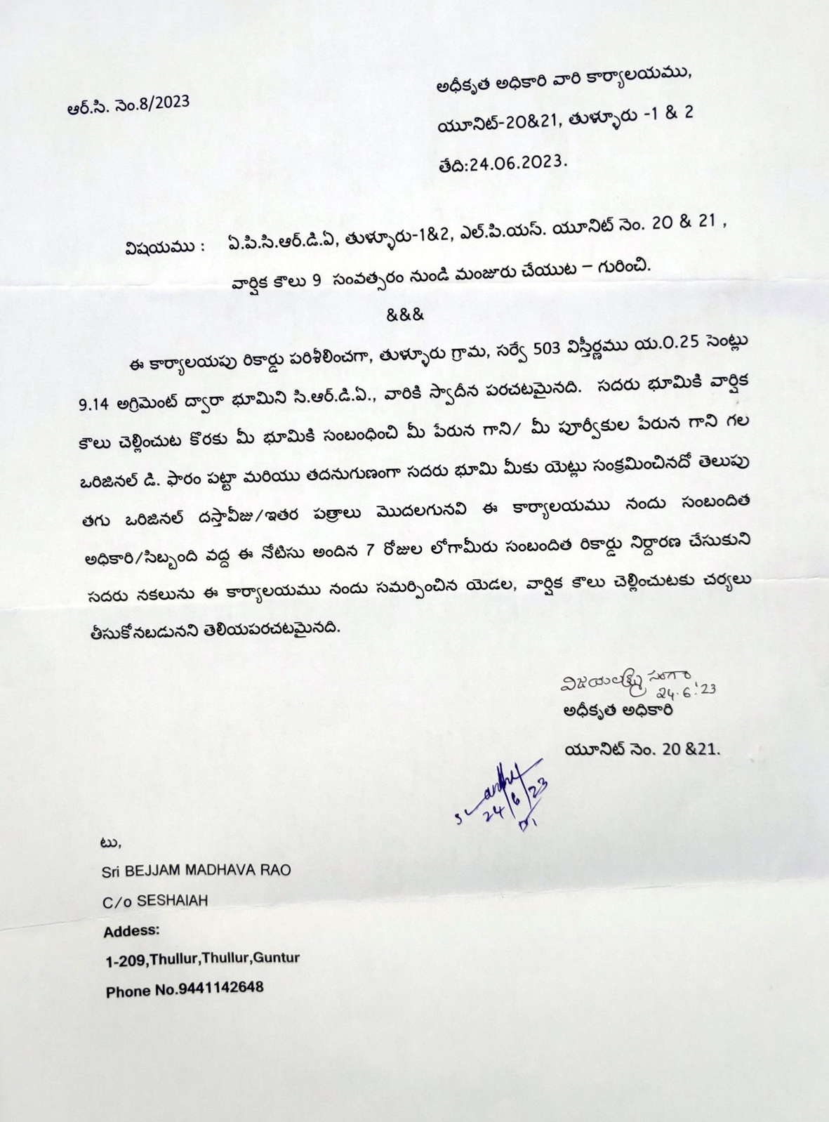 ప్రజాశక్తి - తుళ్లూరు : రాజధాని ప్రాంతంలోని అసైన్డ్ రైతులకు సిఆర్డిఎ అధికారులు నోటీసులు పంపుతున్నారు. రాజధాని నిర్మాణానికి ఇచ్చిన అసైన్డ్ భూములకు సంబంధించిన ఒరిజినల్ డి ఫారం పట్టా, సదరు భూమి మీకు ఎలా సంక్రమించిందో తెలిపే ఒరిజినల్ దస్తావేజు, ఇతర పత్రాలను నోటీసు అందుకున్న వారం రోజుల్లోగా అందజేయాలని నోటీసులో పేర్కొన్నారు. సిఐడి విచారణ పేరుతో రెండేళ్లుగా కౌలు చెల్లించకుండా తాత్సారం చేసిన ప్రభుత్వం తాజాగా పత్రాలు చూపాలంటూ నోటీసులు ఇవ్వడంపై దళితులు, ఇతర పేద వర్గాలకు చెందిన అసైన్డ్ రైతులు తీవ్ర ఆందోళన చెందుతున్నారు. దశాబ్దాల క్రితం ప్రభుత్వం అరెకరం, 30 సెంట్లు చొప్పున అసైన్డ్ భూములను పంపిణీ చేసింది. అసైన్డ్ రైతులు అత్యధికులు పూరిపాకల్లో నివాసం ఉండేవారు. దీంతో పత్రాలను భద్ర పరచడం ఇబ్బంది కరంగా ఉండేది. అగ్నిప్రమాదాలు, తుపానులు వంటివి సంభవించిన సందర్భంలో అవి కాలిపోవడం, పాడయి పోవడం జరిగిందని పేదలు చెబుతున్నారు.