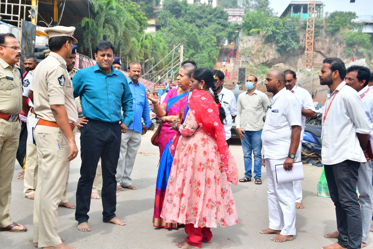 శ్రీ దుర్గా మల్లేశ్వర స్వామి వార్ల దేవస్థానం, ఇంద్రకీలాద్రి దుర్గమ్మ దేవస్థానం ఆధ్వర్యంలో ఈనెల 15న నుండి 19వ తేదీ వరకూ నిర్వహించు శ్రీ అమ్మవారి భవానీ దీక్షా విరమణల నేపధ్యంలో శుక్రవారం విజయవాడ నగర పోలీసు కమిషనర్ కాంతి రాణా టాటా, ఆలయ కార్యనిర్వహణాధికారి దర్భముళ్ల భ్రమరాంబ ఏర్పాట్లను పరిశీలించారు. దేవస్థానం నందు 15 నుండి 19 వరకు (ఐదు రోజులపాటు) రాష్ట్రంలోని పలు ప్రాంతాలకు చెందిన వారు భవానీలు మాలా విరమణకు రానున్న నేపధ్యంలో దుర్గగుడి అధికారులు వినాయకుని గుడి వద్ద నుండి కొండపైకి క్యూ లైన్లతో పాటు సకల సౌకర్యాలు ఏర్పాట్లు చేస్తున్నారు. శ్రీ అమ్మవారి భవానీదీక్షా విరమణ మహాోత్సవాల ఏర్పాట్లను కమిషనర్ పరిశీలించి, ఆలయ అధికారులకు సూచనలు ఇచ్చారు. ఈ కార్యక్రమంలో పశ్చిమ జోన్ ఏసిపి కె. హనుమంతరావు, వన్టౌన్ పోలీస్స్టేషన్ సిఐ ఆర్. సురేష్ రెడ్డి, పోలీసు శాఖ అధికారులు, ఆలయ కార్యనిర్వాహక ఇంజినీర్లు లింగం రమాదేవి, ఆలయ ఇంజినీరింగ్ సిబ్బంది పాల్గొన్నారు.