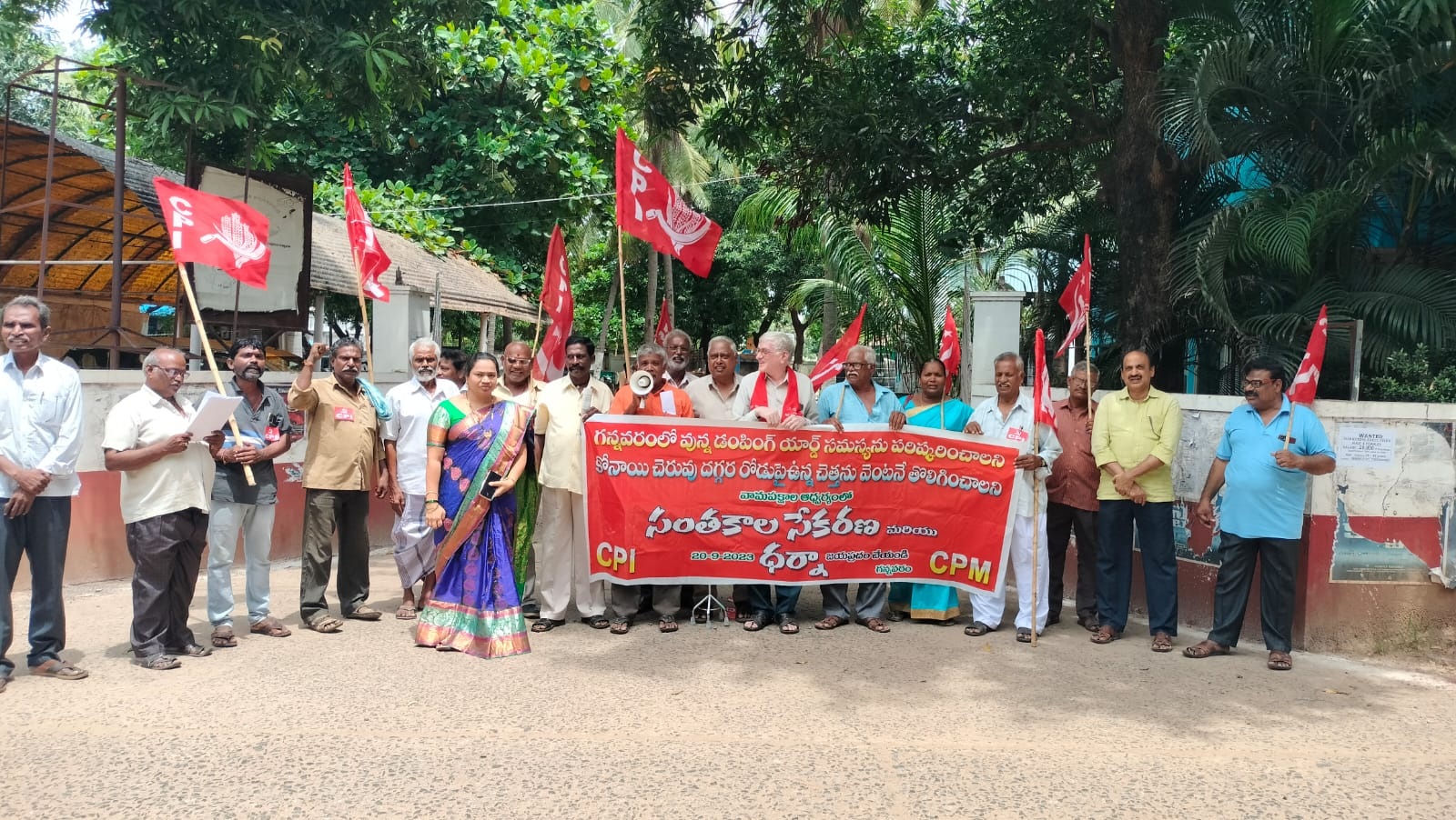 ప్రజాశక్తి-గన్నవరం : గన్నవరంలో చెత్త డంపింగ్ సమస్యను పరిష్కరించాలని డిమాండ్ చేస్తూ బుధవారం గన్నవరం పంచాయతీ కార్యాలయం వద్ద వామపక్షాల ఆధ్వర్యంలో ధర్నా నిర్వహించారు. సిపిఐ జిల్లా నాయకులు పెద్దు వాసుదేవరావు, సిపిఎం మండల కార్యదర్శి మల్లంపల్లి ఆంజనేయులు మాట్లాడుతూ... ఆగిరిపల్లి రోడ్డులో చెత్తను పారవేయడం వల్ల తీవ్రదుర్గంధం వెదజల్లుతూ 10 గ్రామాల ప్రజలు అటుగా వెళ్లేందుకు నానా అవస్థలు పడుతున్నారని తెలిపారు. గతంలో చెత్తను ఈ విధంగానే పోసి దానిని వలన పల్లి తరలించేందుకు 25 లక్షల రూపాయలు పంచాయతీ నిధులు దుర్వినియోగం చేశారని విమర్శించారు. ఇప్పుడు మళ్లీ అదే పని చేయడానికి లక్షల రూపాయలు వ్యయం చేయడానికి అధికారులు సిద్ధమవడం వెనుక అంతర్యం ఏమిటని ప్రశ్నించారు. జిల్లా కలెక్టర్ జోక్యం చేసుకొని గొల్లనపల్లి ఏరియాలో పంచాయితీకి పర్మినెంట్గా రెండు ఎకరాల నుంచి మూడు ఎకరాల వరకు వారి గోతులు కేటాయించి ఇస్తే సమస్యకు పరిష్కారం లభించినట్లు అవుతుందని తెలిపారు. ఆ పని త్వరగా చేయాలని డిమాండ్ చేశారు. అనంతరం సర్పంచ్ కి వినతి పత్రం సమర్పించారు. సర్పంచ్ సౌజన్య మాట్లాడుతూ.. ఈ సమస్యను జిల్లా అధికారులు దృష్టిలో పెట్టడం జరిగిందని త్వరలోనే చెత్తను బయటకు తరలించేందుకు చర్యలు తీసుకుంటా మని తెలిపారు. ఈ కార్యక్రమంలో వామపక్ష నాయకులు పఠాన్ సర్దార్, మల్లంపల్లి జయమ్మ, సాంబశివరావు, మిరప నాగేశ్వ రరావు, కే వెంకటేశ్వరరావు, సిహెచ్ వెంకటేశ ్వరరావు తదితరులు పాల్గొన్నారు.