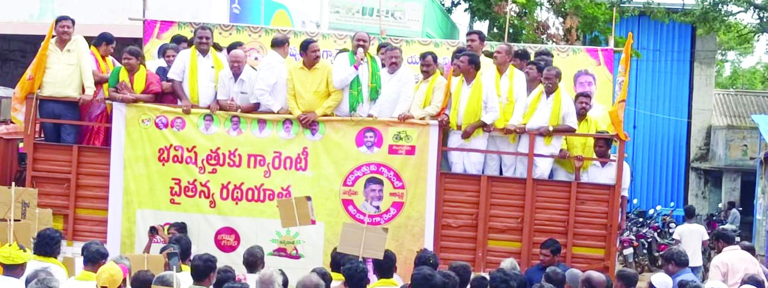 మాజీ ముఖ్యమంత్రి చంద్రబాబు నాయుడుతోనే రాష్ట్రానికి భవిష్యత్తు అని కేంద్ర మాజీ మంత్రి, టిడిపి జాతీయ ఉపాధ్యక్షులు కోట్ల జయసూర్య ప్రకాష్ రెడ్డి తెలిపారు. శుక్రవారం మండలంలోని తారాపురం గ్రామంలో టిడిపి ఇన్ఛార్జీ పాలకుర్తి తిక్కారెడ్డి ఆధ్వర్యంలో, టిడిపి జిల్లా అధ్యక్షులు బిటి.నాయుడు అధ్యక్షతన 'భవిష్యత్తుకు గ్యారెంటీ' బస్సు యాత్ర నిర్వహించారు. ఈ బస్సు యాత్ర తారాపురం గ్రామం నుంచి ప్రారంభమై రంగాపురం, చిన్నకడబూరు, పెద్దకడబూరు గ్రామంలో సాగింది. ఈ సందర్భంగా కోట్ల మాట్లాడారు. జగన్ పాలన అవినీతిమయంగా మారిపోయిందని మండిపడ్డారు. తన తండ్రి కోట్ల విజయభాస్కర్ రెడ్డి రెండుసార్లు ముఖ్యమంత్రిగా రాష్ట్రాన్ని పాలించినా ఏనాడూ అవినీతి, అక్రమాలకు పాల్పడలేదని, నిజాయితీగా పరిపాలించామని గుర్తు చేశారు. టిడిపి కార్యకర్తలపై పోలీసుల చేత తప్పుడు కేసులు బనాయించి భయభ్రాంతులకు గురి చేస్తున్నారని విమర్శించారు. వచ్చే ఎన్నికల్లో జగన్ సర్కారుపై తిరుగుబాటు తప్పదని హెచ్చరించారు. టిడిపి మహానాడు వేదికగా టిడిపి అధినేత చంద్రబాబు ప్రకటించిన మహిళలకు 'మహాశక్తి', యువగళం, అన్న ధాత, ఇంటింటికి నీరు, బీసీలకు రక్షణ చట్టం, పూర్ టు రిచ్ ఆరు అంశాల మినీ మేనిఫెస్టోను ప్రజల్లోకి తీసుకెళ్లాల్సిన బాధ్యత మనందరిపై ఉందన్నారు. జిల్లాలో పెండింగ్ ప్రాజెక్టుల పనులను ప్రారంభించేలా ముఖ్యమంత్రి జగన్పై ఒత్తిడి తెచ్చే దమ్ము, ధైర్యం జిల్లా మంత్రులకు, ఎమ్మెల్యేలకు ఎక్కడిదని ప్రశ్నించారు. టిడిపి అధికారంలోకి వచ్చిన వెంటనే పెండింగ్లో ఉన్న సాగునీటి ప్రాజెక్టులను పూర్తి చేసి జిల్లా రైతులకు అంకితం చేసి మాట నిలబెట్టుకుంటామని భరోసా ఇచ్చారు. రాష్ట్రంలో ఎన్నికలు ఎప్పుడొచ్చినా టిడిపి జెండా ఎగురవేయడం ఖాయమన్నారు. టిడిపి రాష్ట్ర కార్యదర్శి సోమిశెట్టి వెంకటేశ్వర్లు, టిడిపి జిల్లా అధ్యక్షులు బిటి.నాయుడు, ఆదోని ఇన్ఛార్జీ మీనాక్షి నాయుడు, పత్తికొండ ఇన్ఛార్జీ కెఇ.శ్యాంబాబు, కోడుమూరు ఇన్ఛార్జీ ఆకెపోగు ప్రభాకర్, జిల్లా మహిళా అధ్యక్షులు కవిత, ఫుడ్ కమిటీ మాజీ ఛైర్మన్ గుడిసె కృష్ణమ్మ, టిడిపి రాష్ట్ర కార్యదర్శి పాలకుర్తి శ్రీనివాస్ రెడ్డి, తెలుగు రైతు రాష్ట్ర ప్రతినిధి నరవ రమాకాంత్ రెడ్డి, తెలుగు యువత జిల్లా ప్రధాన కార్యదర్శి పాలకుర్తి దివాకర్ రెడ్డి, పెద్దకడబూరు మాజీ ఎంపిపి నరవ శశిరేఖ, టిడిపి మండల అధ్యక్షులు బసలదొడ్డి ఈరన్న, మంత్రాలయం మండల అధ్యక్షులు పన్నగ వెంకటేష్ స్వామి పాల్గొన్నారు.