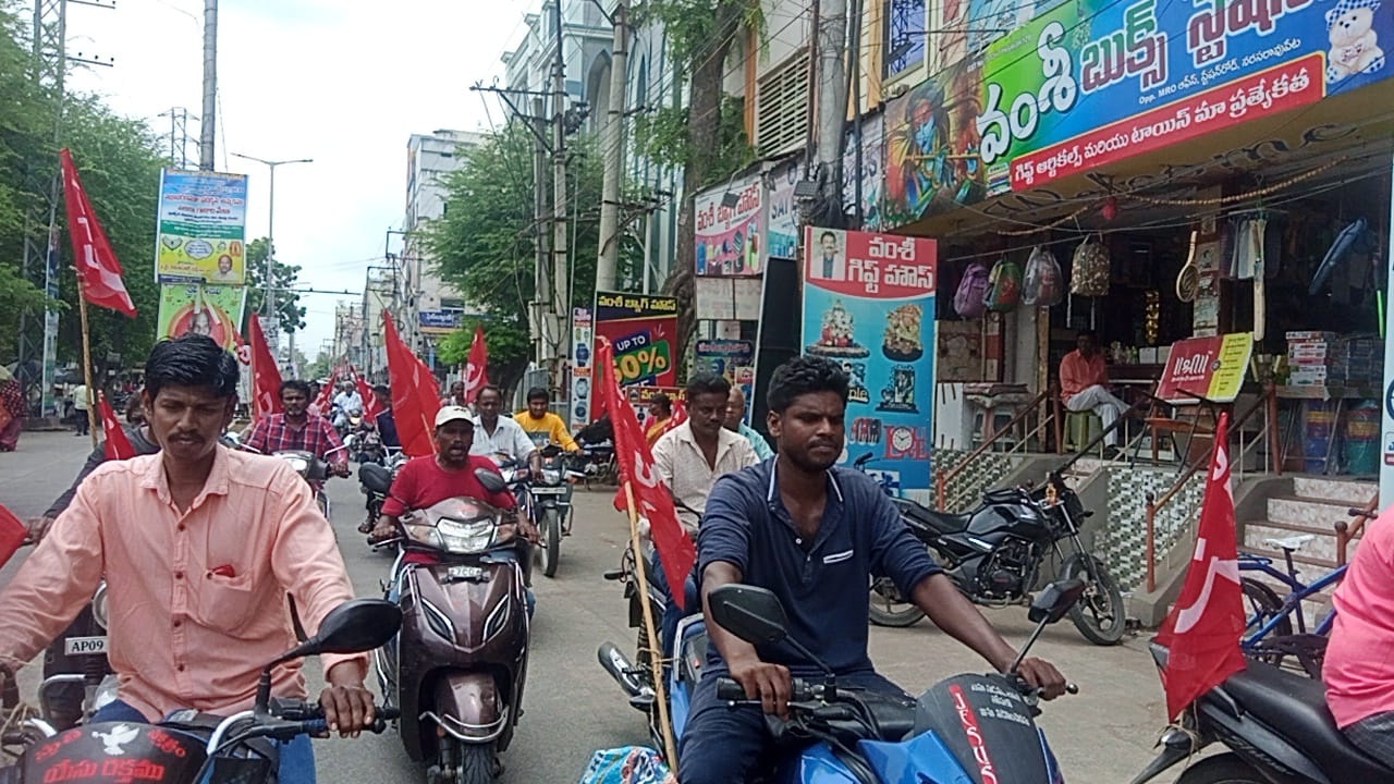 ప్రజాశక్తి - పల్నాడు జిల్లా : కాంట్రాక్టు, ఔట్సోర్సింగ్ విధానంలో పనిచేస్తున్న తమను పర్మినెంట్ చేయాలని మున్సిపల్ కార్మికులు, ఉద్యోగులు డిమాండ్ చేశారు. తమ సమస్యల పరిష్కారం కోసం 24న నిర్వహించే 'చలో విజయవాడ' జయప్రదం కోసం మున్సిపల్ వర్కర్స్ అండ్ ఎంప్లాయీస్ యూనియన్ ఆధ్వర్యంలో పట్టణంలో సోమవారం బైక్ ర్యాలీ చేశారు. స్థానిక మున్సిపల్ కార్యాలయం వద్ద నుండి పట్టణంలోని ప్రధాన వీధుల్లో ర్యాలీ సాగింది. ఈ సందర్భంగా యూనియన్ పల్నాడు జిల్లా కార్యదర్శి ఎ.సాల్మన్ మాట్లాడుతూ అధికారంలోకి వచ్చిన వెంటనే కాంట్రాక్ట్, ఔట్సోర్సింగ్ కార్మికులు, ఉద్యోగులను పర్మినెంట్ చేస్తామని చెప్పిన ముఖ్యమంత్రి జగన్మోహన్రెడ్డి నాలుగున్నరేళ్లయినా తన మాటను నెరవేర్చలేదన్నారు. సమాన పనికి సమాన వేతనం, కనీస వేతనం ఏవీ మున్సిపల్ కార్మికులకు అమలు కావడం లేదని ఆవేదన వ్యక్తం చేశారు. పెరిగిన నిత్యావసర సరుకుల ధరలతో జీవనం కష్టమైందని, అర్ధాకలితోనే కార్మికులు పనులు చేయాల్సి వస్తోందని చెప్పారు. కోవిడ్ కాలంలోనూ ఫ్రంట్లైన్ వారియర్స్గా పని చేసిన తమకు చప్పట్లు కొట్టడం మినహా సదుపాయాలేమీ కల్పించలేదని, చప్పట్లు కడుపు నింపవనే విషయాన్ని సిఎం, మంత్రులు, ఎమ్మెల్యేలు గుర్తించాలని కోరారు. సమస్యలను పరిష్కరించకుంటే ఆశలవారీగా ఉధృత ఆందోళనలు చేస్తామని హెచ్చరించారు. చలో విజయవాడలో మున్సిపల్ కార్మికులు, ఉద్యోగులంతా పాల్గొని జయప్రదం చేయాలని పిలుపునిచ్చారు. ర్యాలీలీ పల్లయ్య, పి.ఏసు, వీరకుమార్, నవీన్, శ్రీను, నరసింహారావు పాల్గొన్నారు.