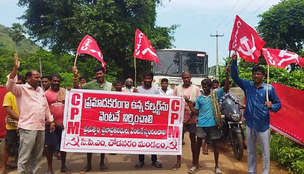 ప్రజాశక్తి-చోడవరం : చోడవరం రోడ్డులో వెంకన్నపాలెం శిధిలమై ప్రమాదకరంగా ఉన్న కల్వర్టు వెంటనే పునర్నిమించాలని, రక్షణ గోడలు నిర్మించాలని సిపిఎం చోడవరం మండల కమిటీ ఆధ్వర్యంలో వెంకన్నపాలెం కల్వర్టు వద్ద ఈరోజు రాస్తా రోకో, నిరసన చేయడం జరిగింది. సీపీఎం నాయకులు కల్వర్టుకి ఇరువైపుల రక్షణ గోడలు లేకపోవడంతో ఎరుపు రంగు చీరలను కట్టారు. ప్రమాద సూచిక బోర్డులను ఏర్పాటు చేశారు. అనంతరం ఈ కార్యక్రమం ఉద్దేశించి సిపీఎం జిల్లా కమిటీ సభ్యులు వివి శ్రీనివాసరావు మాట్లాడుతూ శిథిలావస్థకు చేరిన కల్వర్టులను, రోడ్డులను బాగుచేయలేని పరిస్థితులల్లో ప్రభుత్వం, అధికారులు, స్థానిక ఎం ఎల్ ఏ ఉన్నారన్నారు. సంవత్సరాల తరబడి ఎన్నో సార్లు విన్నవించినా కనీసం పట్టించుకోలేదని, అన్నీ అభివృద్ధి చేస్తున్నామని చెప్పుకున్నామన్న ఊదర కొడుతున్న కనీసం రోడ్లు, కల్వర్టు నిర్మించలేక పోతున్నారన్నారు. సిపిఎం ఇప్పటికే అనేకసార్లు ఆందోళనలు నిర్వహించిందన్నారు. ఆర్&బి అధికారులకు, కలెక్టర్ కు ఫిర్యాదు చేశామన్నారు. ప్రభుత్వం గాని, ప్రజా ప్రతినిధులు కానీ కనీసం పట్టించుకోకపోవడం దుర్మార్గం అన్నారు. అత్యంత ప్రమాదకరంగా ఉన్న ప్రజల ప్రాణాలతో చెలగాటమాదడమే అన్నారు. ఈ రోడ్డు అనకాపల్లి, పాడేరు, విశాఖ జిల్లాలకు ప్రధాన రహదారిగా వున్నది. రోజూ వేలాది మంది ప్రయాణించే ప్రధాన రోడ్డు. రోజూ అనేక మంది వాహన దారులు ప్రమాదాలకు గురౌతున్నారు. సుమారు ఏడాది కాలంలో కల్వర్టులు రక్షణ గోడలు పడిపోయిన, బ్రిడ్జి కూలిపోయే స్థితిలో ఉన్నా స్థానిక అధికారులు, ప్రజాప్రతినిధులు స్పందించడం లేదు. ప్రభుత్వ విప్, స్థానిక ఎమ్మెల్యే, జిల్లా మంత్రులు ఈ రోడ్డు గుండా ప్రయాణిస్తున్న పట్టించుకోకుండా వున్నారు. గడప గడప కు సమస్యలు తెలుసుకుంటున్నామని చెబుతున్న అధికార పార్టీ నాయకులు కల్వర్టులు నిర్మించాలని సంవత్సర కాలంగా పోరాడుతున్న పట్టించుకోకుండా నిర్లక్ష్యం వహించడం అన్యాయం అన్నారు. ప్రధాన రహదారిలో ఈ కల్వర్టులు చాలా ఇరుకుగా ఉండడం కూడా నిత్యం ప్రమాదాలకు, ట్రాఫిక్ జాములకు కారణంగా వున్నది. నిత్యం భారీ వాహనాలు, 3 జిల్లాల బస్సులు, చెరుకు క్రషర్ సీజన్లో చెరుకు లోడు వాహనాలకు ఈ రోడ్లే ఆధారం. ఈ కల్వర్టులను విస్తరించడం కూడా చాలా అవసరం. ప్రజలు, ప్రయాణీకుల ప్రాణాలకు ఏదైనా హాని జరక ముందే స్పందించి కల్వర్టులను పునర్నిమించాలని కోరుతున్నాం. లేనట్లయితే భవిష్యత్తు మా ఉద్యమాలు తీవ్రతరం తెలియజేయడం జరుగుతుందన్నారు. ఈ కార్యక్రమంలో సిపిఎం జిల్లా కమిటీ సభ్యులు వి.వి. శ్రీనివాసరావు, మండల నాయకులు ఎస్ వి నాయుడు, జోగా రాము, ఐత కోటి, గండి శ్రీను, జి హరి , పి సత్తిబాబు రాజు, లక్ష్మణ తదితరులు పాల్గొన్నారు.