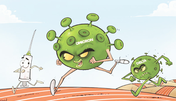 దక్షిణాఫ్రికా, బ్రిటన్, యూరోపియన్ యూనియన్, అమెరికా దేశాల్లో ప్రస్తుతం వ్యాపిస్తున్న కోవిడ్ా19 కేసుల్లో, డెల్టా తరహా వైరస్ ను వేగంగా దాటేసి ఒమిక్రాన్ తరహా వైరస్ ముందుకొచ్చేసింది. సార్స్-కో.వి-2 (దీనినే మనం కరోనా అంటున్నాం) వైరస్ నిత్యం మ్యుటేట్ అవుతూ మార్పులకు లోనవుతోంది. అలా వివిధ రకాల కరోనా వైరస్ లు వచ్చాయి. వాటిలో రెండో దశ చివరికొచ్చేసరికి అన్నింటికన్నా డెల్టా తరహా వైరస్ ముందుండేది. తాజాగా దాన్ని శరవేగంగా దాటేసి ఒమిక్రాన్ తరహా వైరస్ ఇప్పుడు ప్రపంచమంతటా వ్యాపిస్తోంది. ఇప్పటికే రెండు డోసుల వ్యాక్సిన్ వేయించుకున్నవారికి కూడా ఈ ఒమిక్రాన్ సోకుతున్న వైనం ఆందోళన కలిగించే అంశం. ఇప్పటి వరకు అందిన ల్యాబ్ పరీక్షల ఫలితాలను బట్టి ఈ విషయం నిర్ధారించవచ్చు. ఐతే ఇంకా పూర్తి వివరాలు రావాల్సి వుంది. ఇక్కడ కాస్త సంతోషించదగ్గ విషయం ఏమంటే (సంతోషిద్దామా?), వ్యాక్సిన్ రెండు డోసులూ వేయించుకున్నవారికి ఒమిక్రాన్ సోకినా వారి ఆరోగ్యం సంక్లిష్టం కావడం లేదు. అంటే మన శరీరాలు తమ రోగ నిరోధక శక్తిని కరోనాను తట్టుకునేటట్టు పెంపొందించుకోవడం, దానికి వ్యాక్సినేషన్ దోహదపడడం జరిగిందన్నమాట.