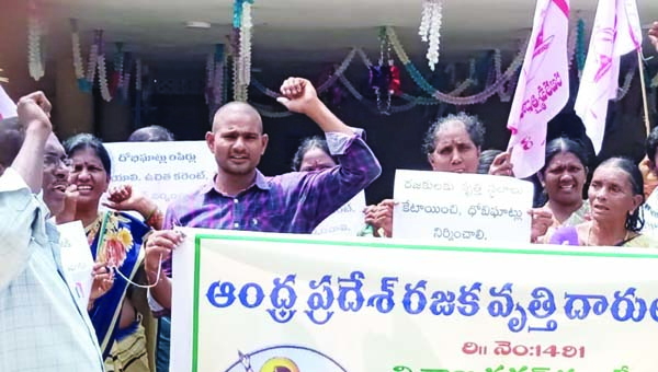 ధర్నా చేస్తున్న రజక సంఘం నాయకులు ఈశ్వరరావు, వృత్తిదారులు