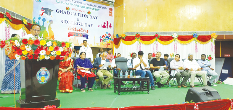 ప్రజాశక్తి -ఎఎన్యు:ఆచార్య నాగార్జున విశ్వవిద్యాలయంలోని ఇంజినీరింగ్ కళాశాలలో బుధవారం ఘనంగా గ్రాడ్యుయేషన్ డే, కాలేజ్ డేల ఉత్సవాలు నిర్వహించారు. గ్రాడ్యుయేషన్ డే ఉత్సవాలకు ముఖ్యఅతిథిగా హాజరైన బెంగళూరు ఇస్రోలోని కెపాసిటీ బిల్డింగ్ అండ్ పబ్లిక్ ఔట్ రీచ్ డైరెక్టర్ ఎన్ సుధీర్ కుమార్ మాట్లాడుతూ విలువలతో కూడిన విద్యా ప్రమాణాలను నిత్యజీవితంలో సమాజ శ్రేయస్సుకై ఉపయోగపడే నూతన ఆవిష్కరణల కోసం విద్యార్థులు వినియోగించాలని తెలిపారు. ముఖ్య అతిధి ఆచార్య నాగార్జున విశ్వవిద్యాలయం ఉపకులపతి ఆచార్య పి రాజశేఖర్ మాట్లాడుతూ విద్య అనేది ప్రతి మనిషి యొక్క వ్యక్తిత్వాన్ని తెలియజేస్తుందని తెలిపారు. ఫిలిం మ్యూజిక్ డైరెక్టర్ శ్రీ యశ్వంత్ నాగ్ మాట్లాడుతూ విద్యార్థులు నిత్యం ఉత్సాహంగా ఉంటూ అన్ని కళలలోనూ రాణించాలన్నారు. కార్యక్రమంలో విద్యాలయ రిజిస్ట్రార్ ఆచార్య బి కరుణ, విశ్వవిద్యాలయ రెక్టార్ ఆచార్య పి వరప్రసాద్ మూర్తి ఇంజనీరింగ్ పట్టా తీసుకుంటున్న విద్యార్థులకు శుభాకాంక్షలు తెలిపారు. కార్యక్రమానికి కళాశాల ప్రిన్సిపల్ ఆచార్య పి సిద్దయ్య అధ్యక్షత వహించారు. గౌరవ అతిథులుగా ఆచార్య ఈ శ్రీనివాసరెడ్డి, డాక్టర్ జి ప్రతిభ, డాక్టర్ ఎం శ్రీనివాసరెడ్డి, తదితరులు పాల్గొన్నారు.