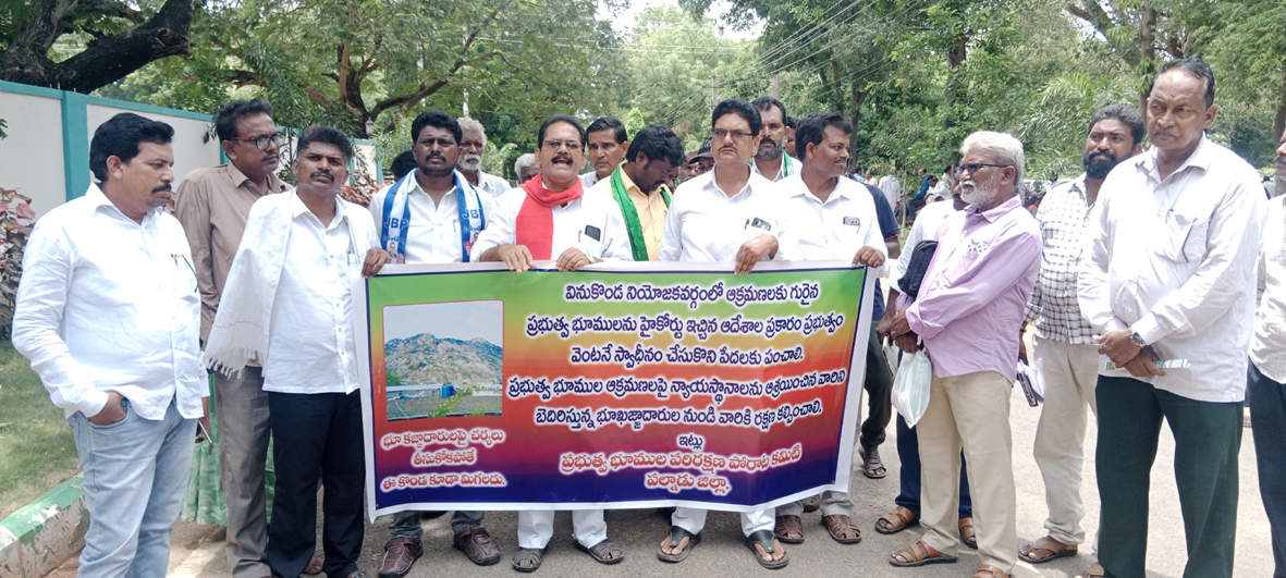 ప్రజాశక్తి - పల్నాడు జిల్లా : వినుకొండ నియోజకవర్గంలో 175 ఎకరాల ప్రభుత్వ భూమిని ఆక్రమించిన ఎమ్మెల్యే బొల్లా బ్రహ్మనాయుడు, మూల్పురి అగ్రిటెక్ సంస్థ, వీరికి సహకరి ంచిన రెవెన్యూ అధికారులపై తక్షణమే చర్యలు తీసుకోవాలని ప్రజా సంఘాల నాయకులు డిమాండ్ చేశారు. ఈ మేరకు కలెక్టరేట్లో సోమవారం నిర్వహించిన 'జగనన్నకు చెబుదాం'లో ఫిర్యాదు చేశారు. ఈ సందర్భంగా నాయకులు మాట్లాడుతూ లోకాయుక్తలో సురభి వెంకటేశ్వర్లు, హైకోర్టులో ప్రజావ్యాజ్యం వేసిన కిర్తిపాటి వెంకటేశ్వర్లుకూ ఒత్తిళ్లు మొదలవుతు న్నాయని, వారికి, వారి కుటుంబాలకు రక్షణ కల్పించాలని కోరారు. ఆ భూము లపై మూణ్ణెల్లులోగా విచారణ జరిపి స్వాధీనం చేసుకోవాలనే తీర్పును అమలు చేయాలన్నారు. నూజెండ్ల మండలం తలార్లపల్లి పంచాయతీ దాట్లవారిపాలెంలో ఆర్ఎంపి వైద్యుడు పోతిరెడ్డి వెంకటేశ్వ రరెడ్డి 646/4 సర్వే నంబర్ 123 ఎకరాలు ఆక్రమించారని, ఏళ్ల తరబడి పోరాటం చేస్తున్నా ఫలితం లేదని చెప్పారు. కార్యక్రమంలో భూ పోరాట కమిటీ కన్వీనర్ కోట నాయక్, వివిధ సంఘాలు, పార్టీల నాయకులు వై.వెంకటేశ్వరరావు, డాక్టర్ జి.జాన్పాల్, ఎన్.శ్రీనివాసరావు, రెడ్ బాషా, మస్తాన్వలి, ఓర్సు కృష్ణ, జి.బాల, ఆర్.ప్రసన్నకుమార్, పి.విజరు, పి.రాజా, పి.అంకారావు, ఎన్.రామారావు, శ్రీనివాసరావు పాల్గొన్నారు.