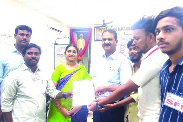 ప్రజాశక్తి-కాకినాడ ఎంఎస్ఎన్ పీజీ సెంటర్ను అభివద్ధి చేయాలని ఎస్ఎఫ్ఐ డిమాండ్ చేసింది. ఈ మేరకు నన్నయ యూనివర్సిటీ విసి పద్మరాజుకు శుక్రవారం వినతిపత్రం ఇచ్చారు. ఎస్ఎఫ్ఐ కాకినాడ జిల్లా కార్యదర్శి ఎం.గంగా సూరిబాబు, జిల్లా సహాయ కార్యదర్శి జి. దినేష్ కుమార్ పీజీ సెంటర్లో అనేక సమస్యలు ఉన్నాయన్నారు. ఈ సమ్యసలు పరిష్కరించి సెంటర్ను అభివృద్ధి చేయాలని కోరారు. ఈ కార్యక్రమంలో పి.వరహాలు, సాయిత్, తేజ పాల్గొన్నారు.